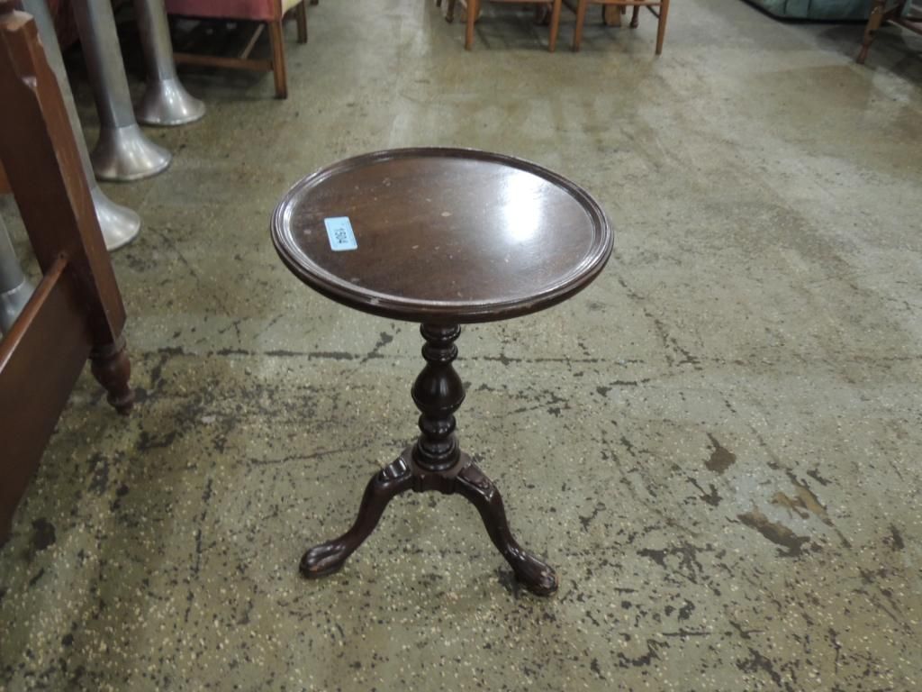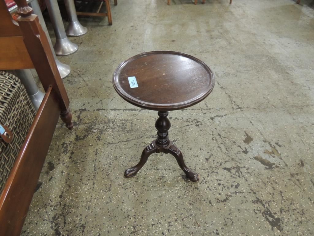 SMALL ROUND WOODEN SIDE TABLE OR PLANT STAND. AS SHOWN SEE PHOTO FOR MORE DETAILS.