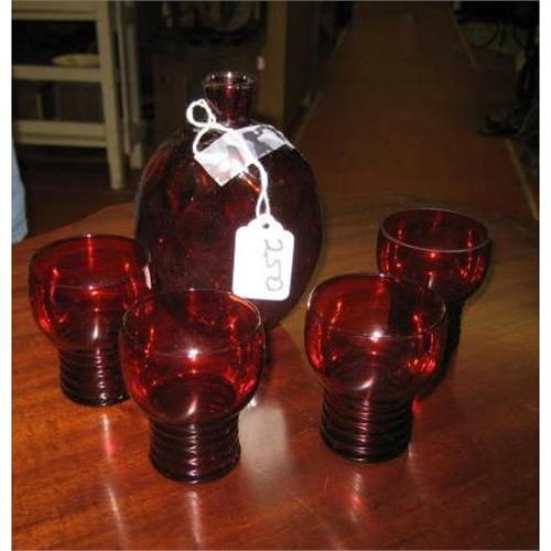 SMALL RUBY RED DECANTER & 4 RUBY RED GLASSES