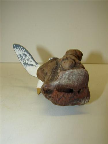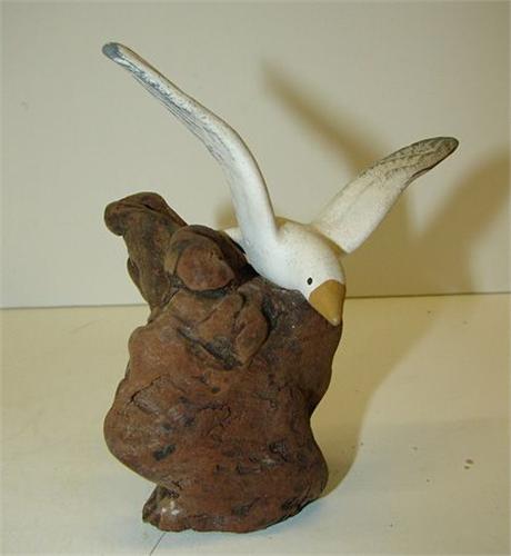 SMALL DECORATIVE SEAGULL CARVING. Depicts a seagull with raised wings on driftwood base. Base is signed illegibly on bottom. 4” H