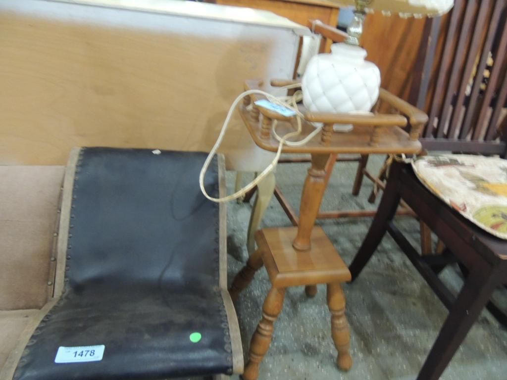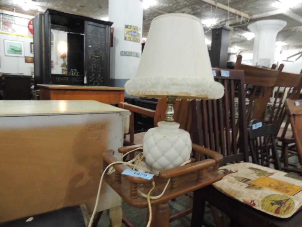 SMALL SIDE TABLE PLANT STAND SQUARE WITH LEDGE. AND CERMAIC LAMP. AS SHOWN SEE PHOTO FOR MORE DETAILS.