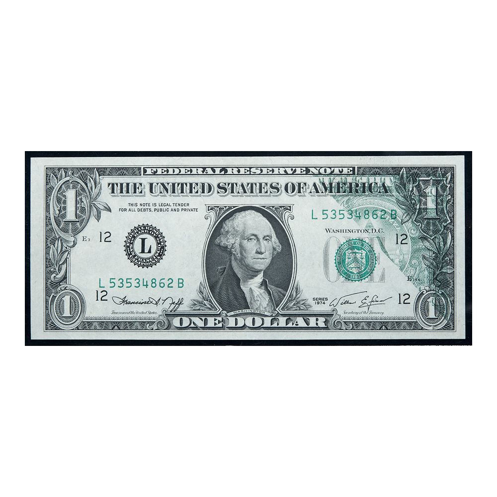 SMALL SIZE ERROR NOTE. Partial Back to Face Offset. 1.00 Series 1974 FRN. Fr. 1908-L. Serial #L5354862B. PCGS graded Choice About New 58PPQ. Estimated Value 250 - UP