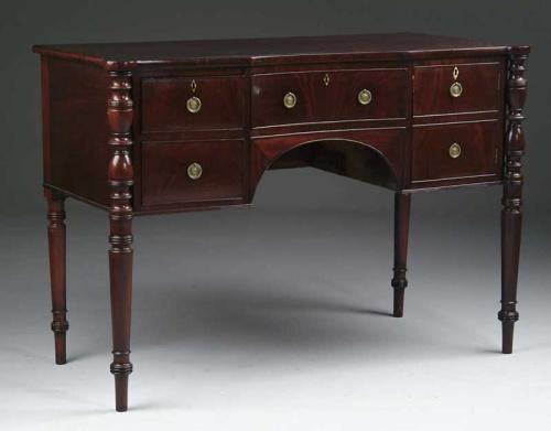 SMALL SIZE MAHOGANY SHERATON SERVER. Shaped top server has central concave drawer over a arched center skirt. All flanked by two drawers on one side and one cupboard door with simulated double drawer front. The two front fully turned column legs have opposing ring and vase decoration ending in a tapered round leg with pointed foot. The drawers have ring hardware and key is present for the locks that have ivory escutcheon plates. French polish finish. Possibly North Shore, Massachusetts. SIZE: 33-1/2” h x case 45-1/4” w x top 48-1/2” at widest x 22” at deepest. CONDITION: Very good. 9-27700