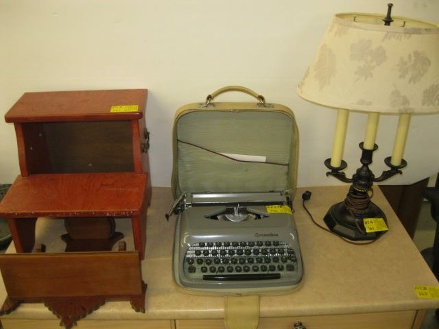 SMALL STEP, WALL MOUNT SHELF UNIT, PORTABLE TYPEWRITER, LAMP