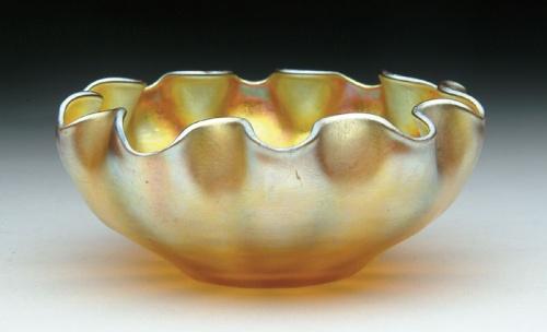SMALL TIFFANY BOWL. Wonderful small Tiffany bowl has crimped petal shaped sides. Signed on the underside "LCT" and retaining an original Tiffany paper label. SIZE: 4-1/2 in. dia x 2 in. t. CONDITION: Very good to excellent. 5-61520