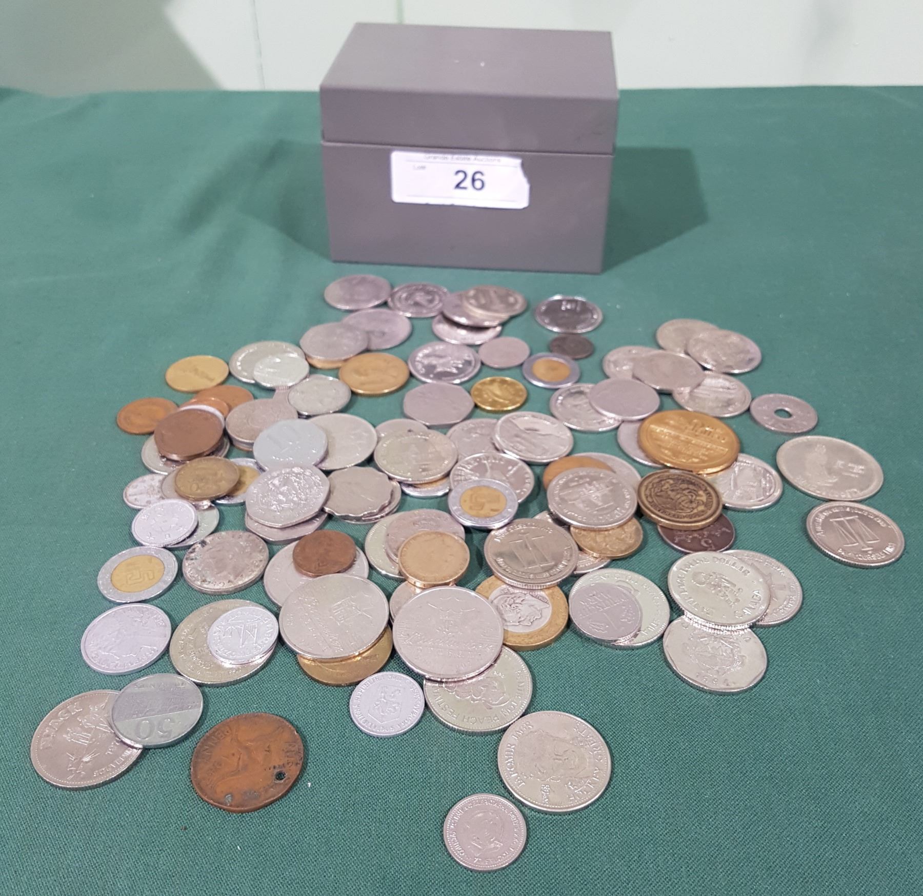 SMALL TIN BOX W/APPROX 100 WORLD COINS