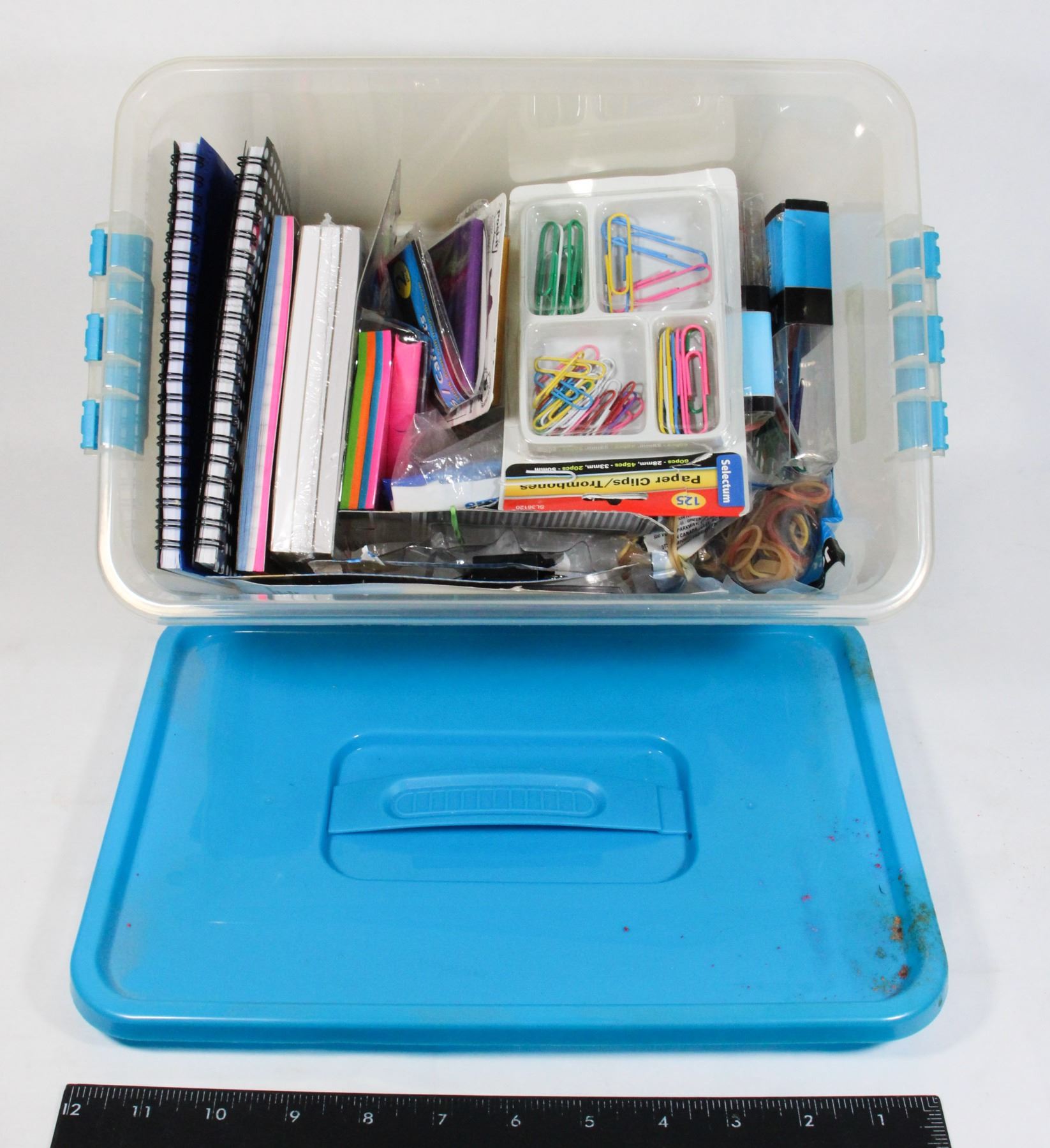 SMALL TOTE OF STATIONARY AND OFFICE SUPPLIES