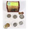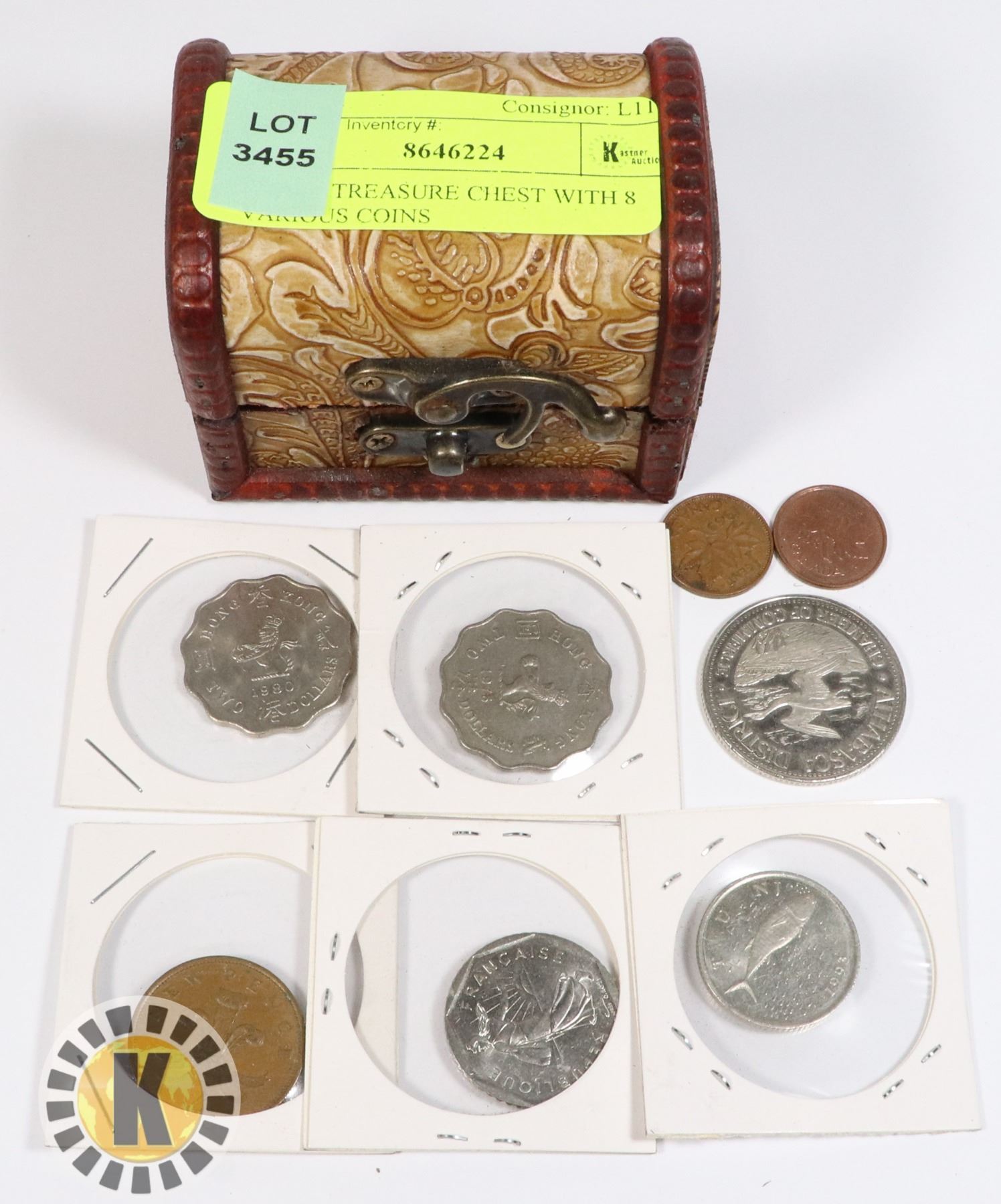 SMALL TREASURE CHEST WITH 8 VARIOUS COINS