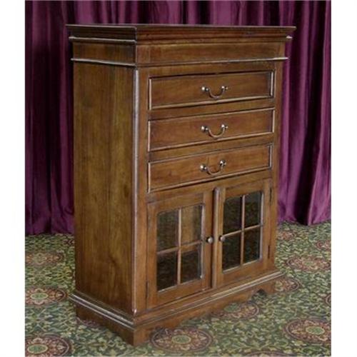 THREE DOVETAILED DRAWERS TO THE TOP AND TWO PANED GLASS CABINET DOORS TO THE BASE OPENING TO INTERNAL STORAGE...