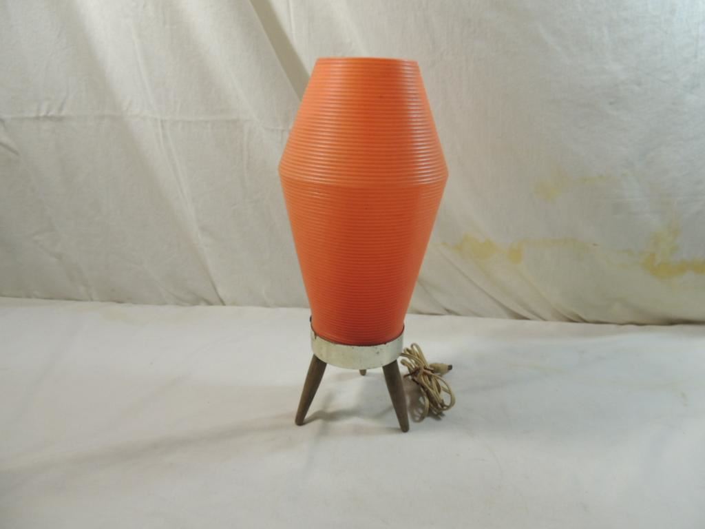 SMALL VINTAGE TABLE LAMP, NIGHT STAND LAMP, DESK LAMP ATOMIC ORANGE PLASTIC AND WOODEN BASE LAMP AS SHOWN SEE PHOTO FOR MORE DETAILS.