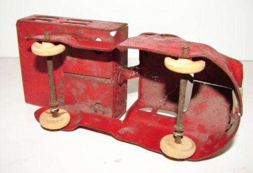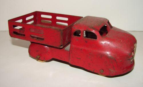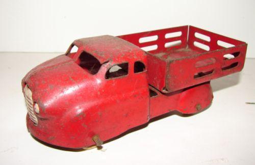 SMALL VINTAGE PRESSED STEEL TRUCK WITH STAKE BODY. Wooden wheels. Shows some loss and rusting to paint. 6” L