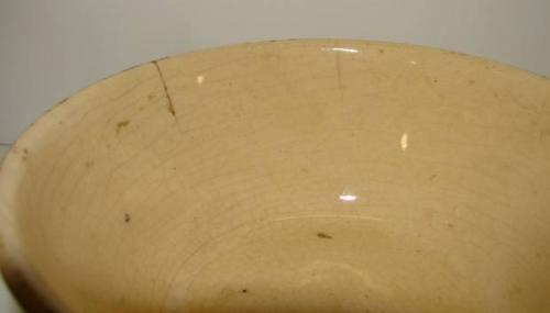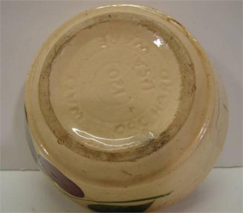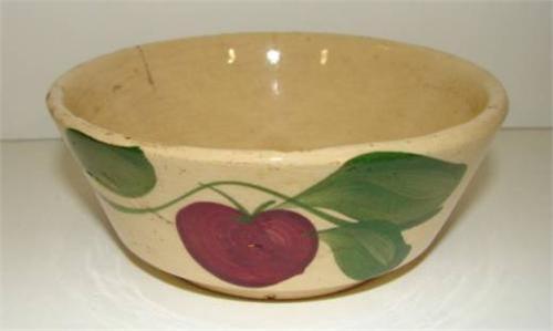 SMALL WATT APPLE DECORATED BOWL. Shows major signs of crazing as well as two vertical tight hairline cracks. Marked on bottom “120”. 2” H, 5” Dia.