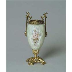 Lot 394 SMALL WAVE CREST VASE. Embossed scrolls and enameled floral decoration, original metal handles and base. SIZE: 6” t. CONDITION: Very good to excellent. 5-68454 (200-300)