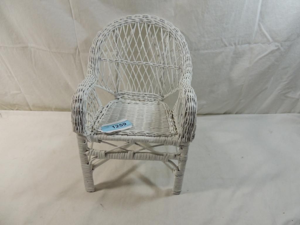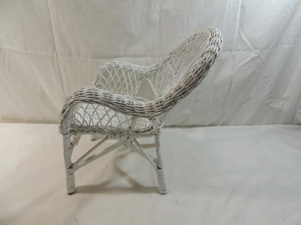 SMALL WHITE WICKER DOLL CHAIR RATTAN DOLL CHAIR AS SHOWN SEE PHOTO FOR MORE DETAILS.