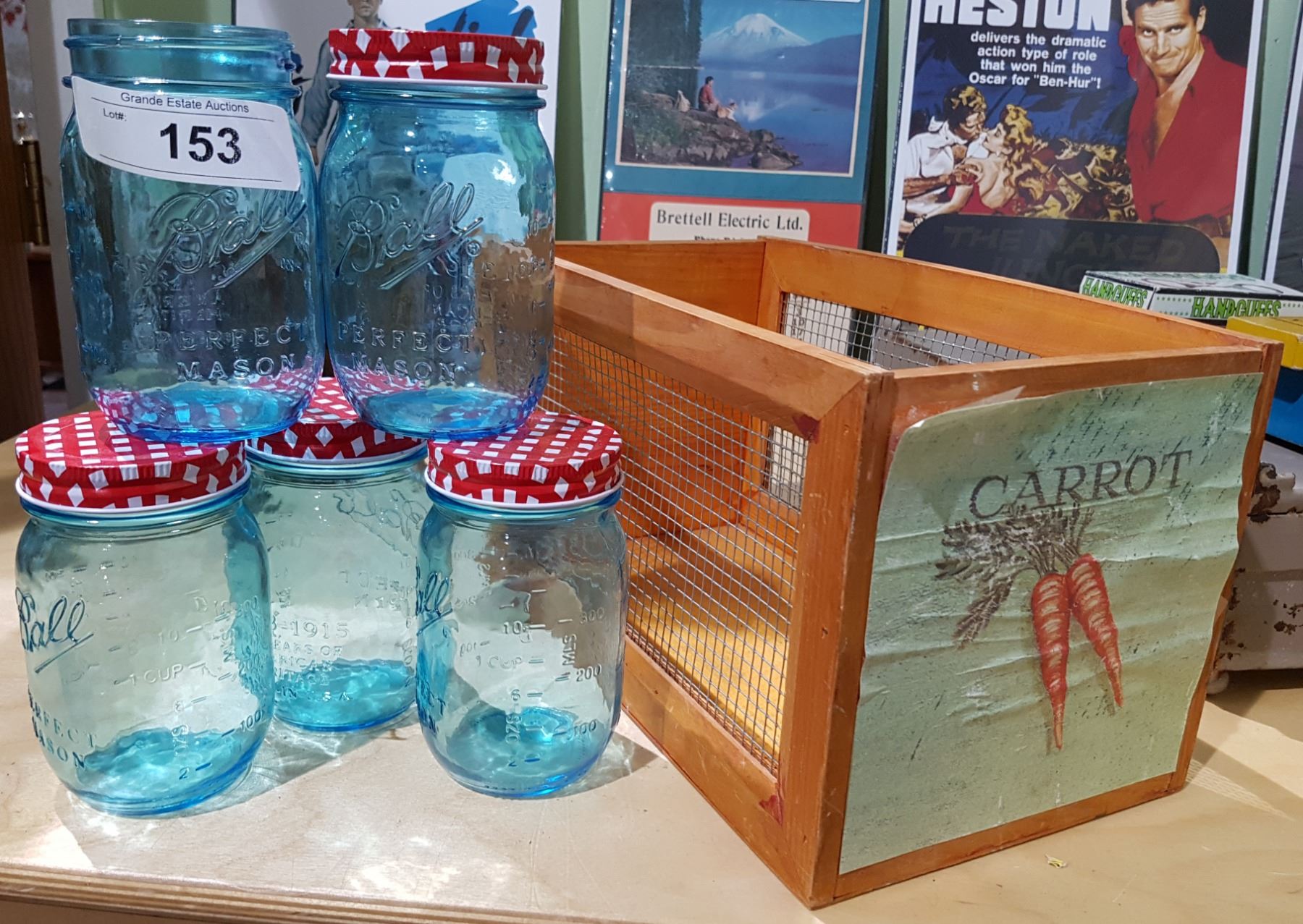 SMALL WOOD CRATE & 5 BLUE CANNING JARS