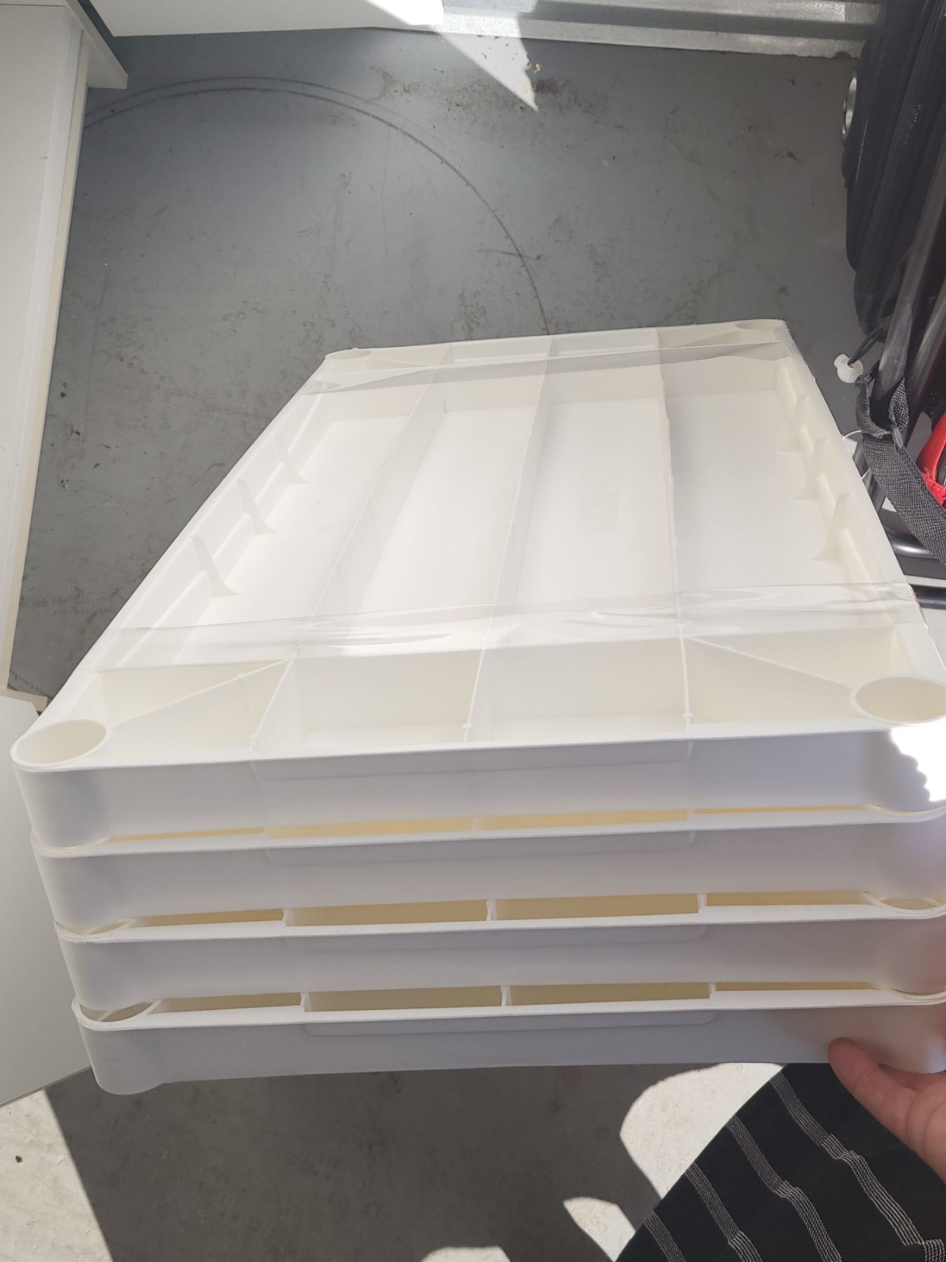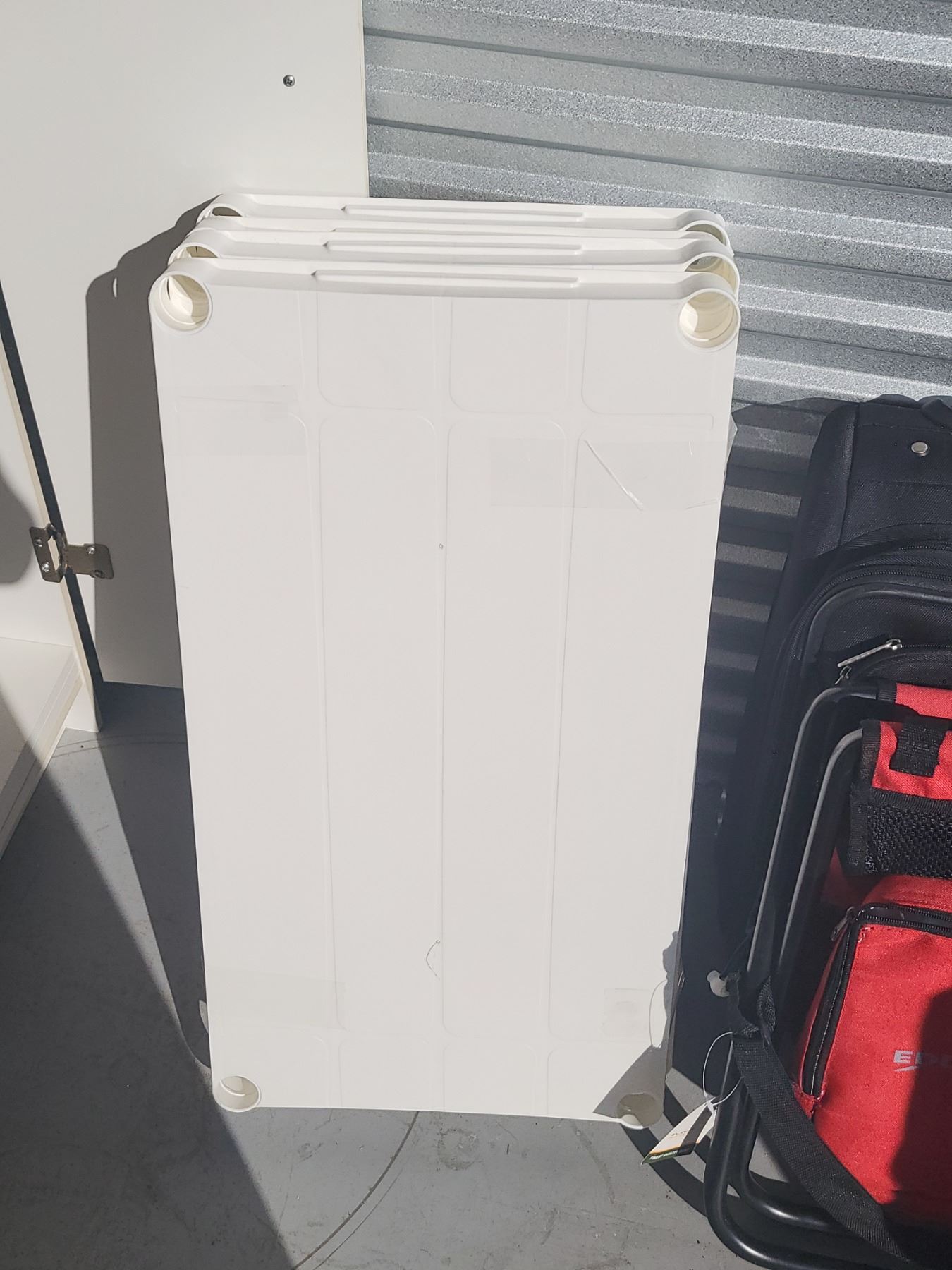 SMALLER 4 SHELF WHITE SHELVING WITH LEGS. IMMACULATE CONDITION. LEGS ARE SECURED IN BETWEEN THE SHELVES