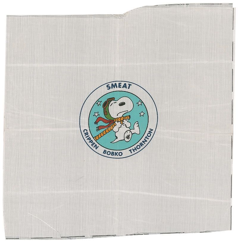 A 9 x 9 swatch of Beta cloth with a printed 3-inch diameter mission insignia depicting Snoopy in his flight cap and goggles struggling with a rope around his neck. In fine condition, with previous storage folds. The SMEAT experiment was conducted by NASA as a 56-day vacuum chamber test to evaluate equipment and procedures proposed for use in the Skylab missions.