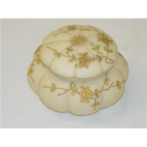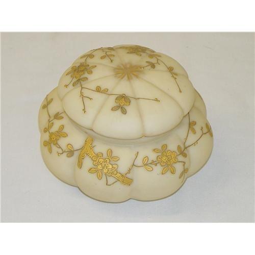 3 1/2" SMITH BROS. ART GLASS COVERED DRESSER BOX-CREAM COLORED W/ HEAVY GOLD FLORAL DECORATION ON MELON RIBBED FORM BODY, RED SMITH BROS. SHIELD W/ LION TRADEMARK STAMP ON BASE - WEAR & LOSSES TO DECORATION, INSIDE RIM WEAR, IMPERFECTIONS;