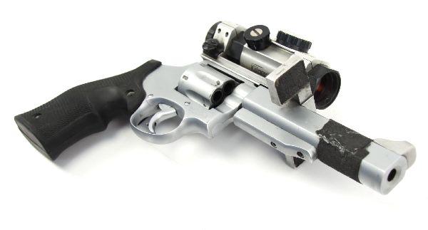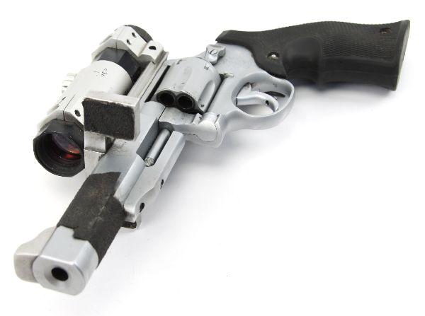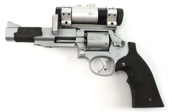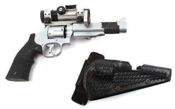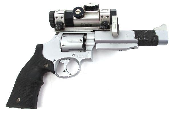 Smith & Wesson custom built competition target pistol in .38 special. Model 10-9 frame, with 6 inch match barrel, and custom rubber grips. Gilmore Master Series red dot sight. Stabilizer over barrel, and weight on end for recoil reduction. Customized hammer with highly sensitive pull. Bore is very good, a finish, and grips are in excellent condition. Some powder residue around cylinder, but can be easily cleaned. Sold with custom fit leather holster. Overall very good condition. SN: 914 Caliber: .38 Serial #: 914