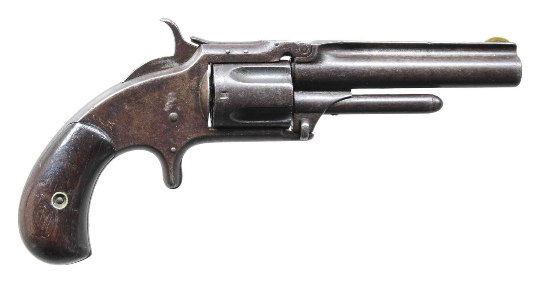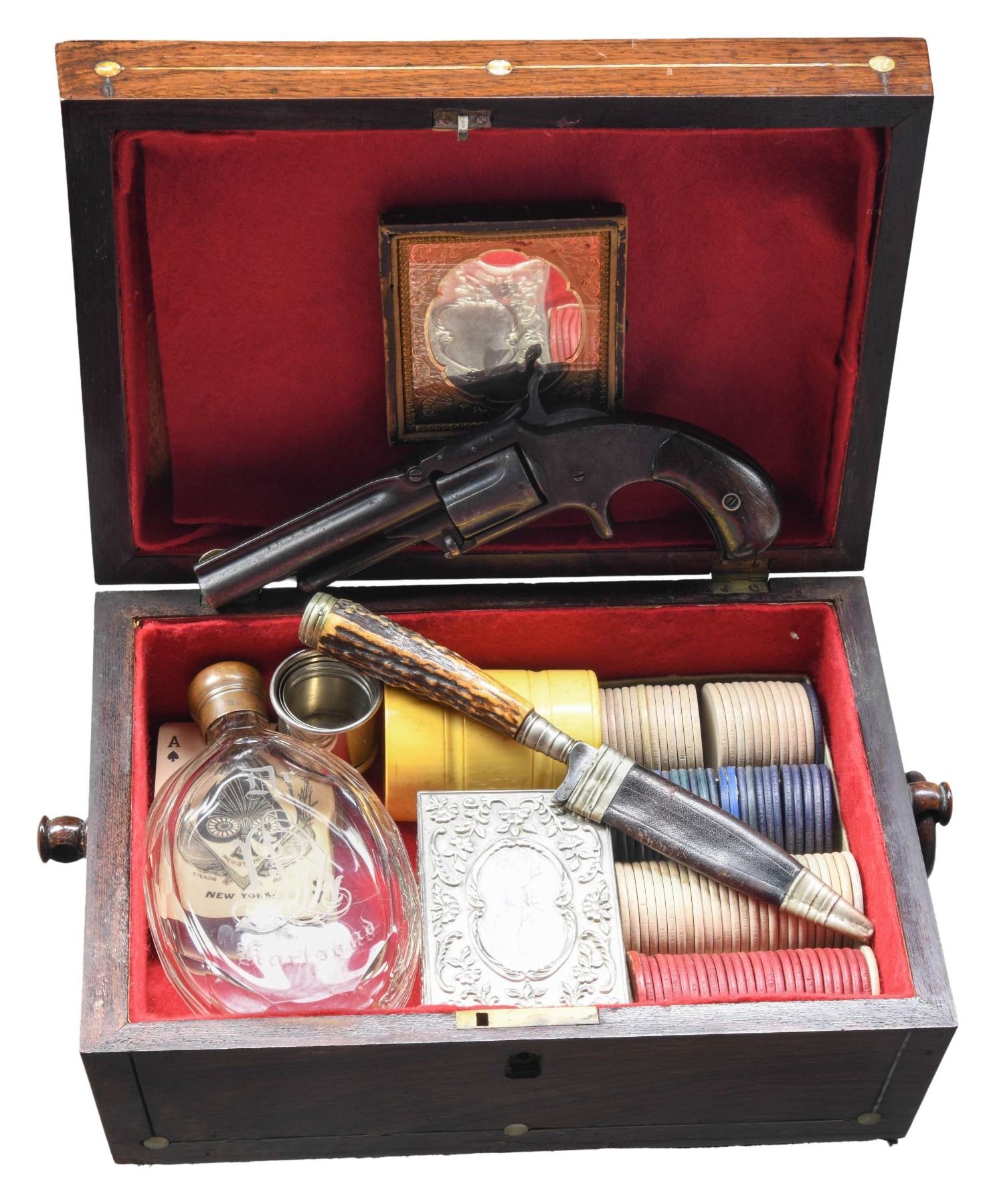 Cal. 32 RF. S# 77951. Bbl. 3 1/2". Round blade front sight. New Model 1 1/2 with assembled Old West Style Gambling Kit. Hardwood grips. UNATTACHED ACCESSORIES: assembled old west style gambling kit with hardwood case with red interior & Daguerreotype photo on inside of to lid. Also included are a bone handle knife with sheath, two 19th century dice, four sets of poker chips, a set of vintage style playing cards & a clear liquor bottle marked "Dr. Karlsbad". CONDITION: grips have added varnish with scattered dings, flaking & handling marks. Metal is an overall dull gray patina with scattered pitting & overall oxidation. Cyl. spends freely when hammer is cocked. Pitted bore with visible worn rifling. (01-27910/MJC). ANTIQUE. $1000-1500.