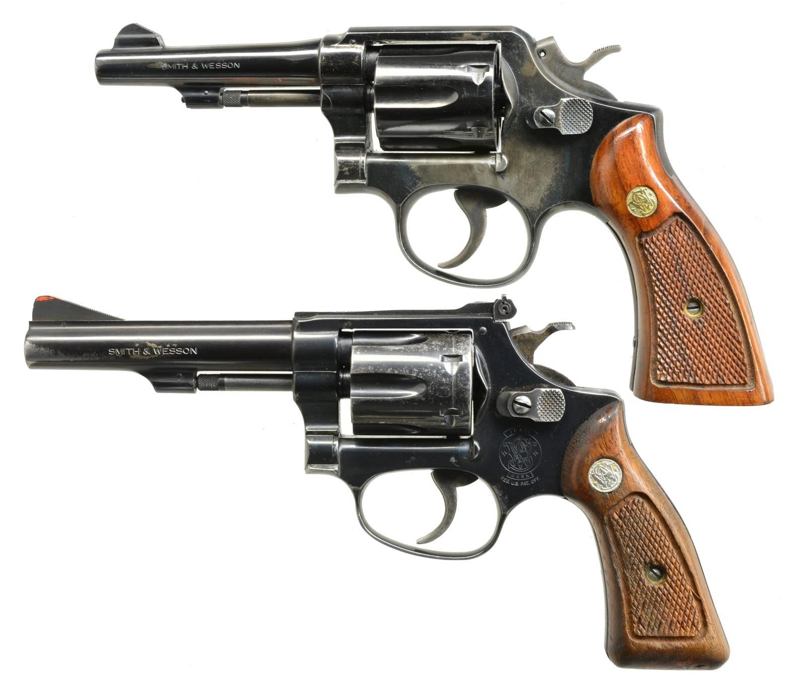 1) MODEL 10-5. Cal. 38 S&W Spl. S# C868919. Bbl. 4" w/ integral ramp front sight. Rear sight is integral w/ top of frame. 2-Piece S&W checkered grips. Standard trigger & hammer. 6 Shot cyl. CONDITION: blue is very good w/ minor knicks & scratches w/ wear on sharp edges. Grips have original finish w/ good checkering & minor depression on left grip. Bore is good. Gun is in time. (20-3032/BT). 2) MODEL 34-1. Cal. 22 LR. S# M205403. Bbl. 4" ribbed w/ integral ramp w/ orange paint as an insert. Adj. rear sight. Standard checkered S&W grips. Standard hammer & trigger. 6 Shot cyl. Commonly referred to as a “kit gun”. CONDITION: original blue is fair. Muzzle wear on both sides of bbl. Blue loss on cyl. Rub mark on right side of frame. Grips are solid w/ traces of original finish. Good checkering. Flattened points on left grip. Bore is bright. Gun is in time. (20-3041/BT). BOTH MODERN. $450-900.