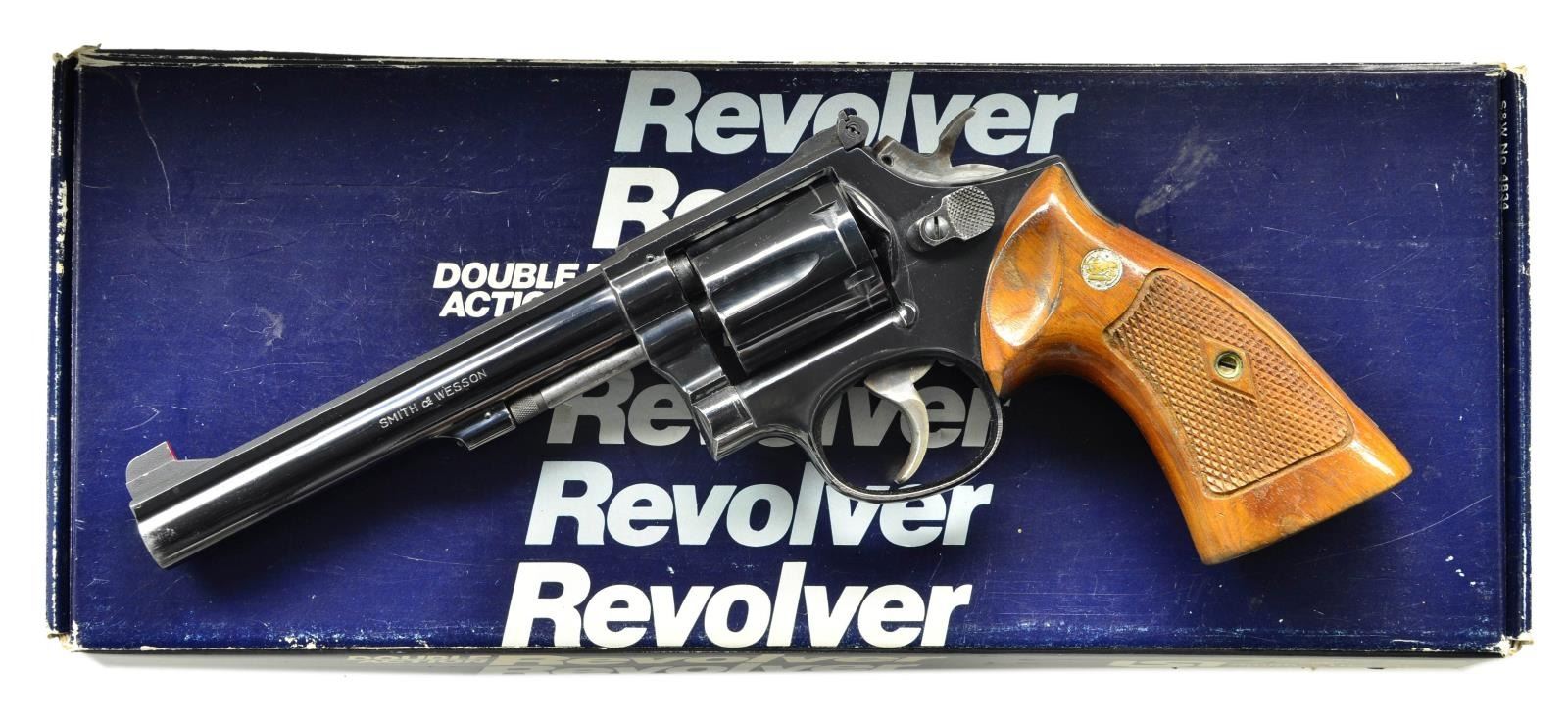 Cal. 38 Spl. S# K755431. Bbl. 5 1/2". Micrometer rear sight & Patridge front sight that shows some faint red paint. Blued finish. Checkered target grips w/ thumb recess. UNATTACHED ACCESSORIES: S&W box that has its label removed. CONDITION: grips show some handling wear & flaking. Trigger & hammer are turning gray w/ traces of case colors & light oxidation. Blued surfaces retain 85% original blue w/ a drag line on cyl., some fading to gray, a few spots of freckling & some high edge wear. Very good bore. (22-6376/MJC). CURIO. $350-550.