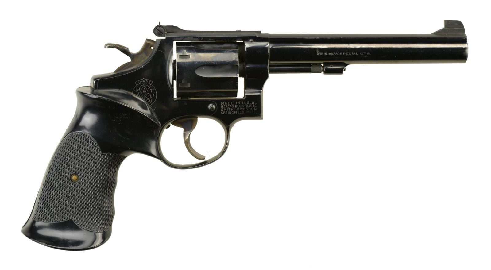 Cal. 38 S&W Special. S# K376202. Bbl. 6". Blued Model 14 (1959) traditional double action revolver. Serrated top barrel strap. Patridge front sight w/ adj. rear. 6 Shot fluted cyl. Serrated front & backstrap. Checkered hammer spur & cyl. release. Black plastic checkered grips w/ thumb rest on left grip. CONDITION: blued finish is complete & consistent displaying thinning on bbl. Light drag line on cylinder w/ some spotting. Frame exhibits some scratching that coincides w/ top of grips. Grips illustrate some wear, primarily at bottom. Bright bore w/ sharp rifling. Timing appears fine in both single & double action. (22-3130/JZ). CURIO. $300-500.