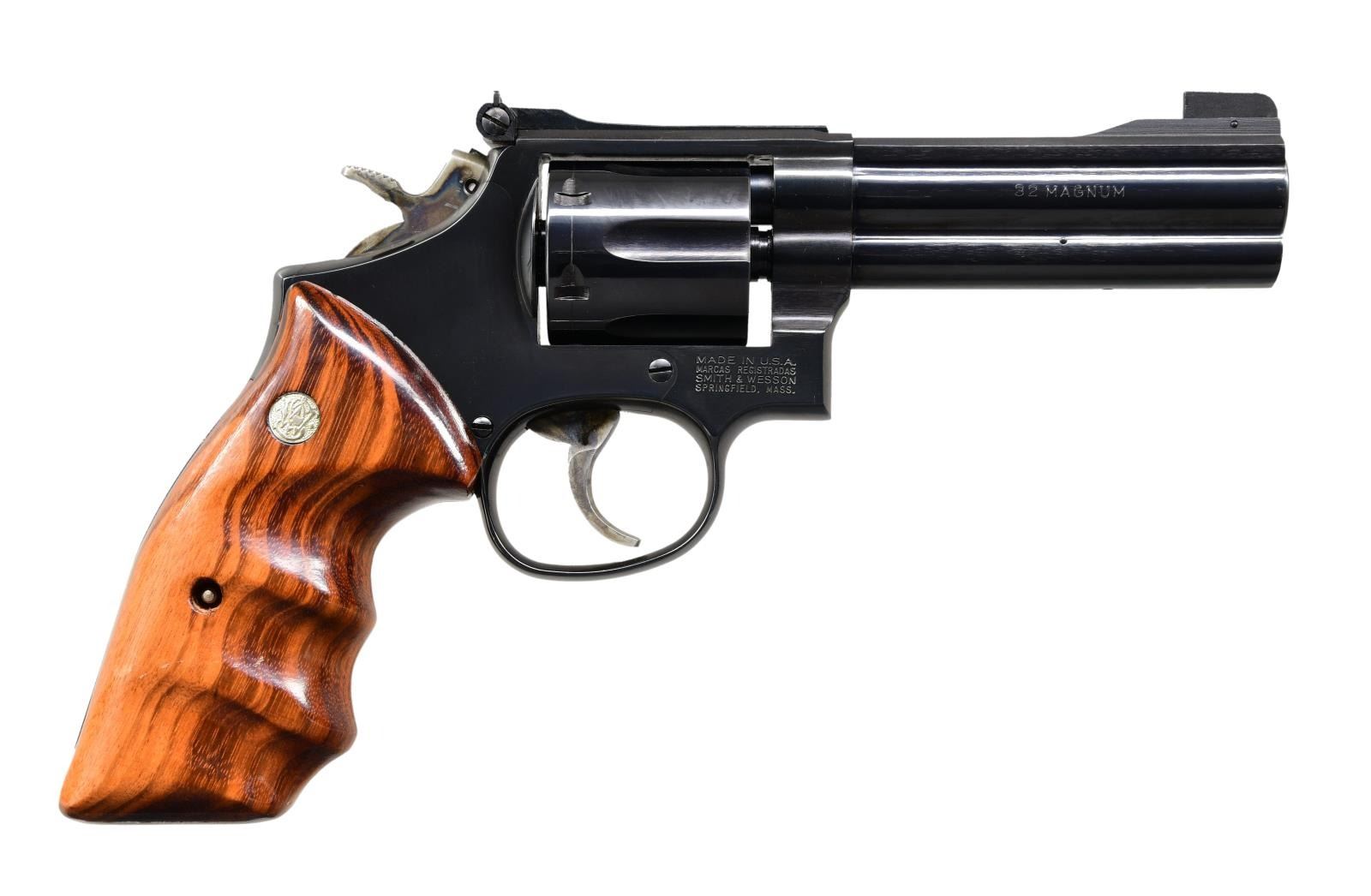 Cal. 32 H&R Mag. S# BFE7907. Bbl. 4". Patridge front sight. Adjustable square notch rear sight. Blued finish w/ case colored trigger & hammer. Goncalo Alves finger groove grips w/ silver S&W silver medallions. UNATTACHED ACCESSORIES: matching numbered factory box w/ manual, paperwork & cleaning kit. CONDITION: cyl. shows a moderate drag line. Grips & metal show a couple minor handling marks. Other aspects near excellent. (24-1719/MJC). MODERN. $1200-1800.