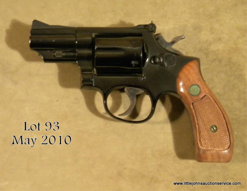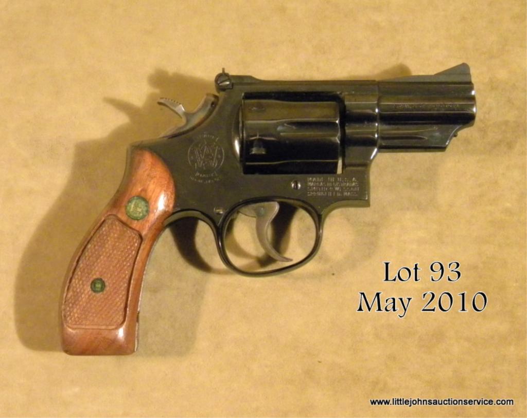 SMITH & WESSON 19-3, # 1K38400, .357 mag., 3" pinned barrel, adjustable sights, checkered medallion grips. Revolver is in very good to fine condition overall, showing 95-97% original finish, with just minimal pin prick pitting. Bore is very good, although there is a minor nick in the crown. Grips are very good showing corrosion on the medallions, and some handling marks, but no chips or cracks. Est. $200-$400.