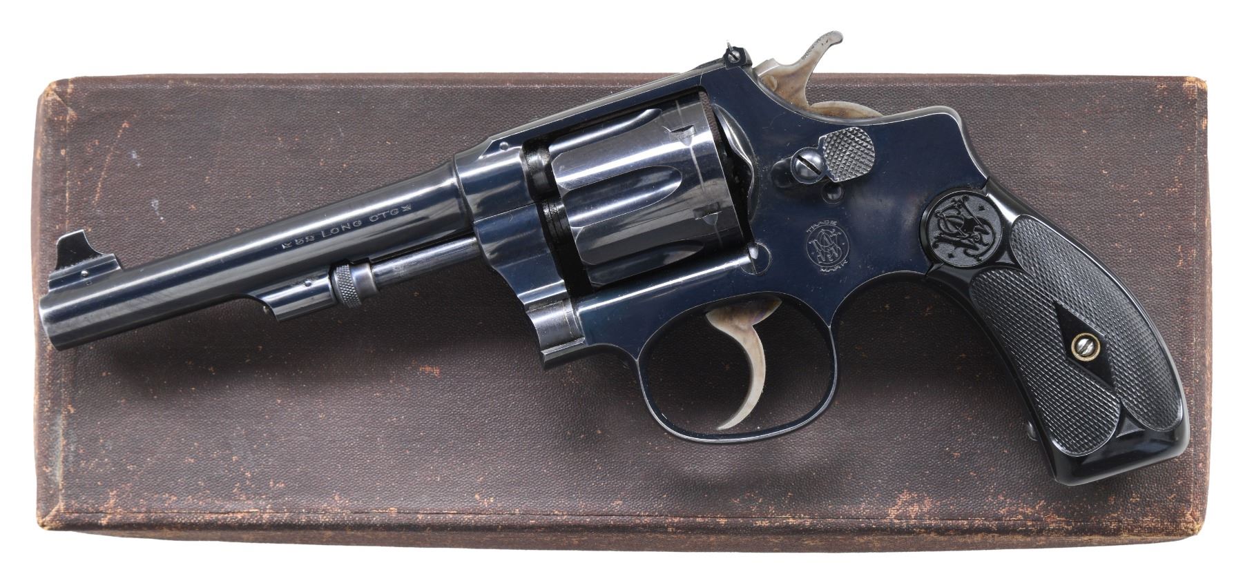 CHANGE TARGET DA REVOLVER. Cal. 32 S&W Long. S# 50510. Bbl. 4 1/4". Target blade front sight. Adjustable square notch rear sight. Matching numbers on frame, bbl., cyl., extractor & right grip panel. 1st Change 32 HE Model of 1903 Target revolver made 1904-1906 Blued finish with case colored trigger & hammer. Checkered black hard rubber grips with S&W monograms. UNATTACHED ACCESSORIES: vintage unnumbered factory box with cleaning rod. CONDITION: grips show some light handling marks & wear. Trigger & hammer retain most of their case colors with some light operational wear. Balance of metal retains 90-92% original blue with some edge wear, light oxidation, fading & a drag line on cyl. Action is functional when hand cycled. Bright near excellent bore. PROVENANCE: From the Lifelong Collection of George Staden S&W Member #3451. (25-61/MJC). CURIO. $1500-2500.