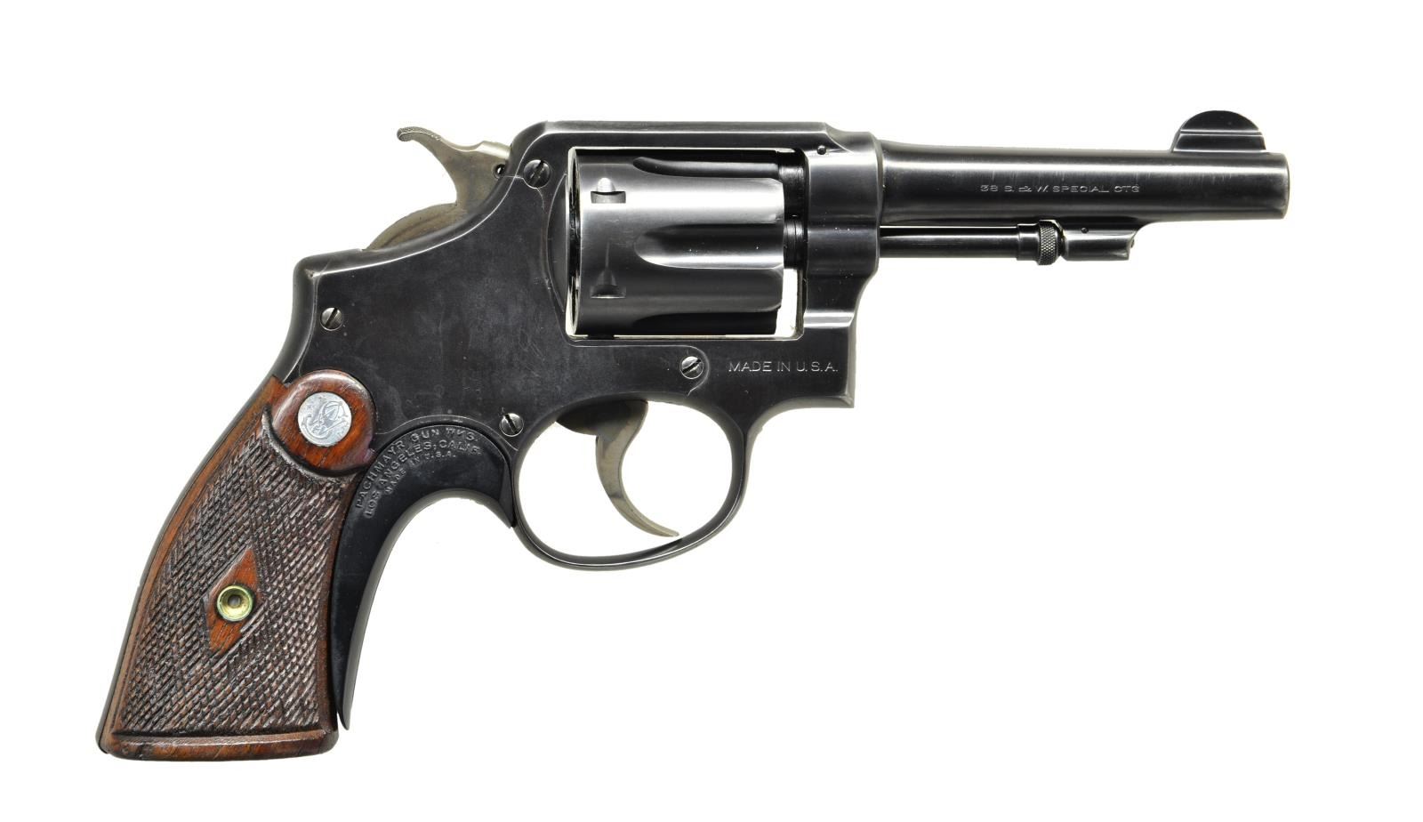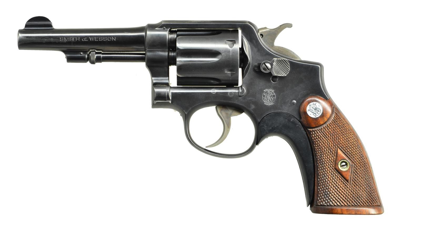 VER. Cal. 38 Spl. S #445276. Bbl. pinned 4". rnd. blade front sight. Serial number has white highlight. Checkered hammer & smooth trigger. Blue finish w/ case colored hammer & trigger. Unnumbered checkered S&W servicegrips w/ silver medallions. Pachmayr grip adapter present. CONDITION: grips show moderate handling wear from the years. Metal retains 60% of an old reblue w/ some high edge wear, cyl wear & scattered fading. Very good bore w/ a spot of pitting & some light frosting. (22-3588/MJC). CURIO. $300-500.