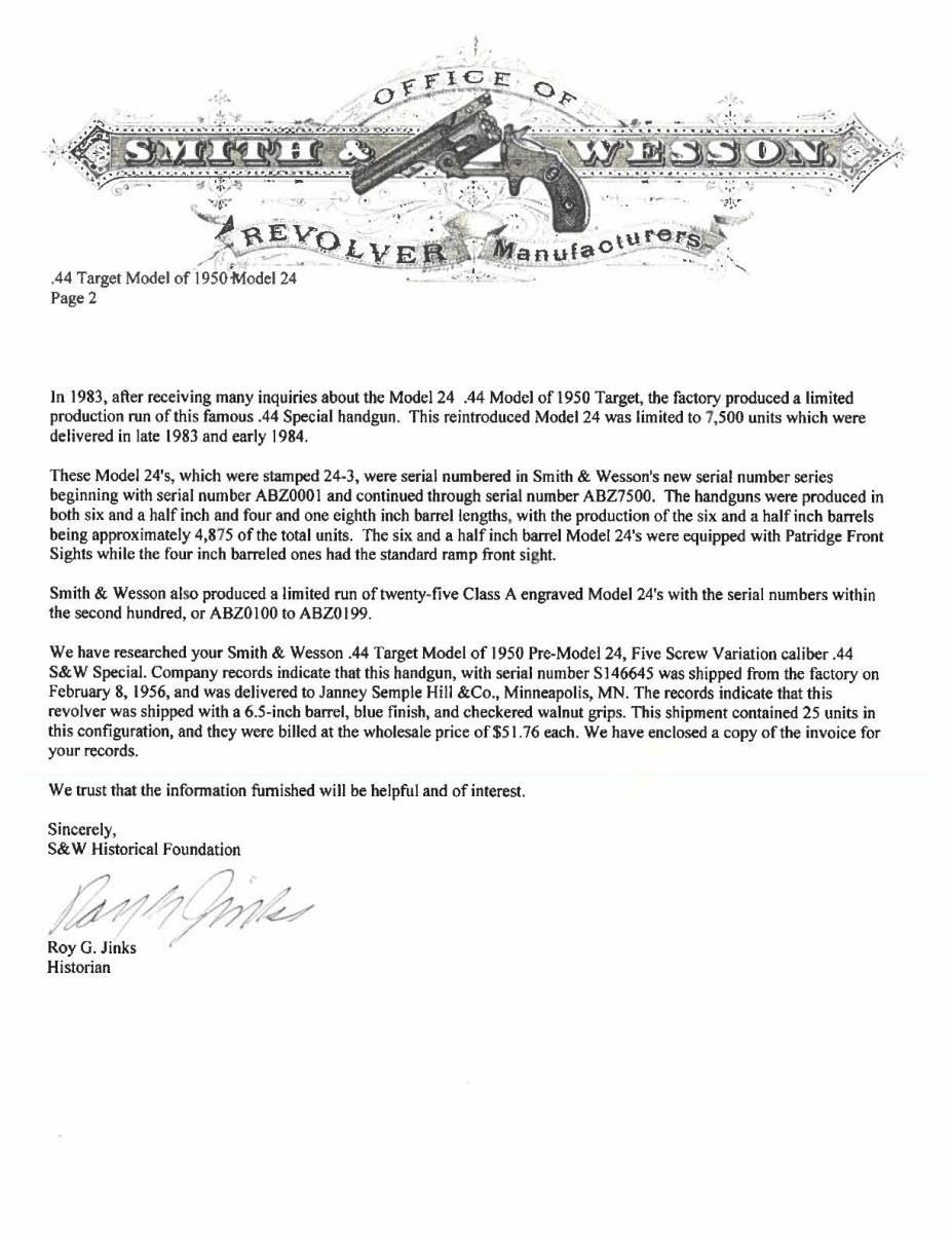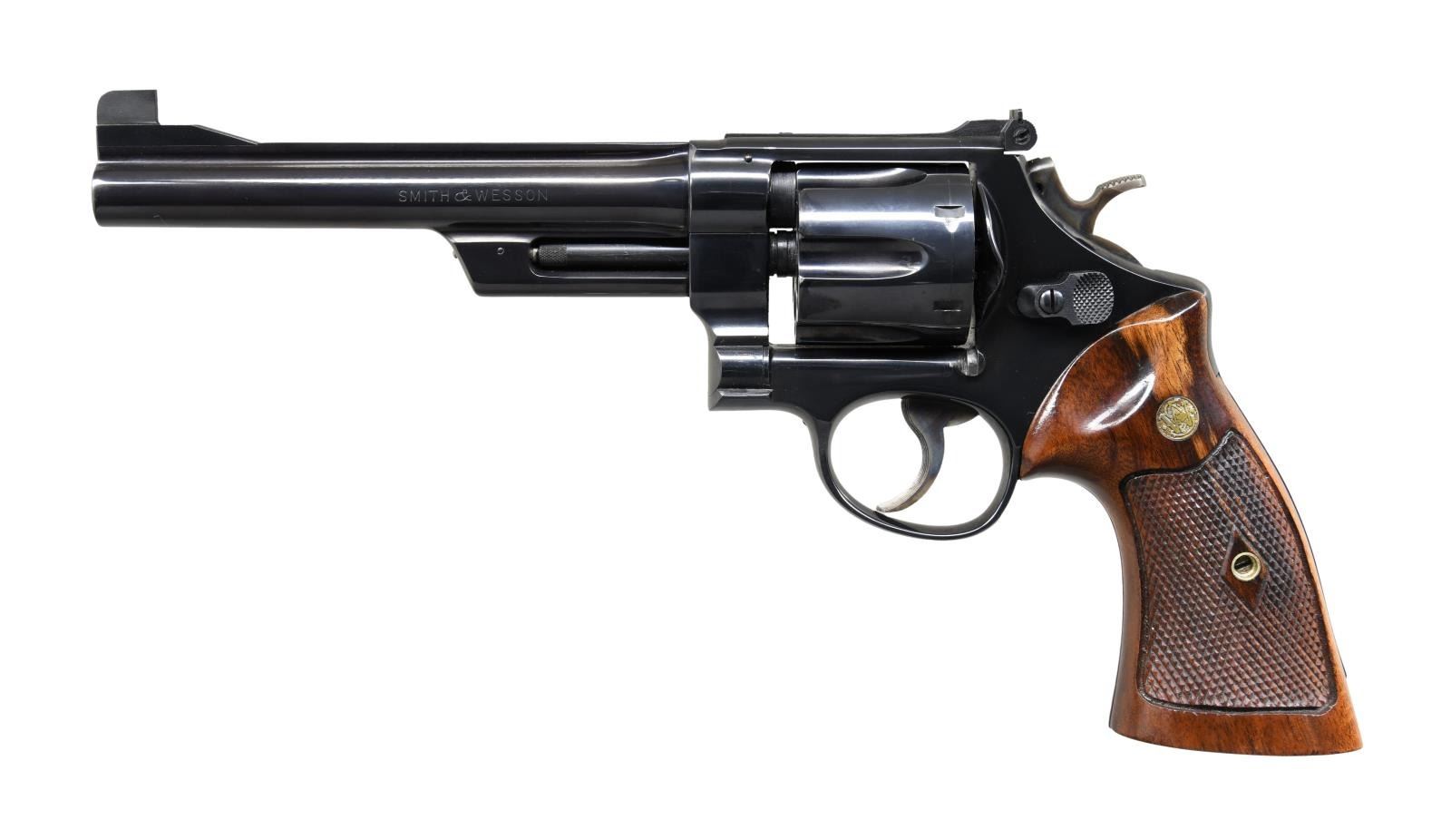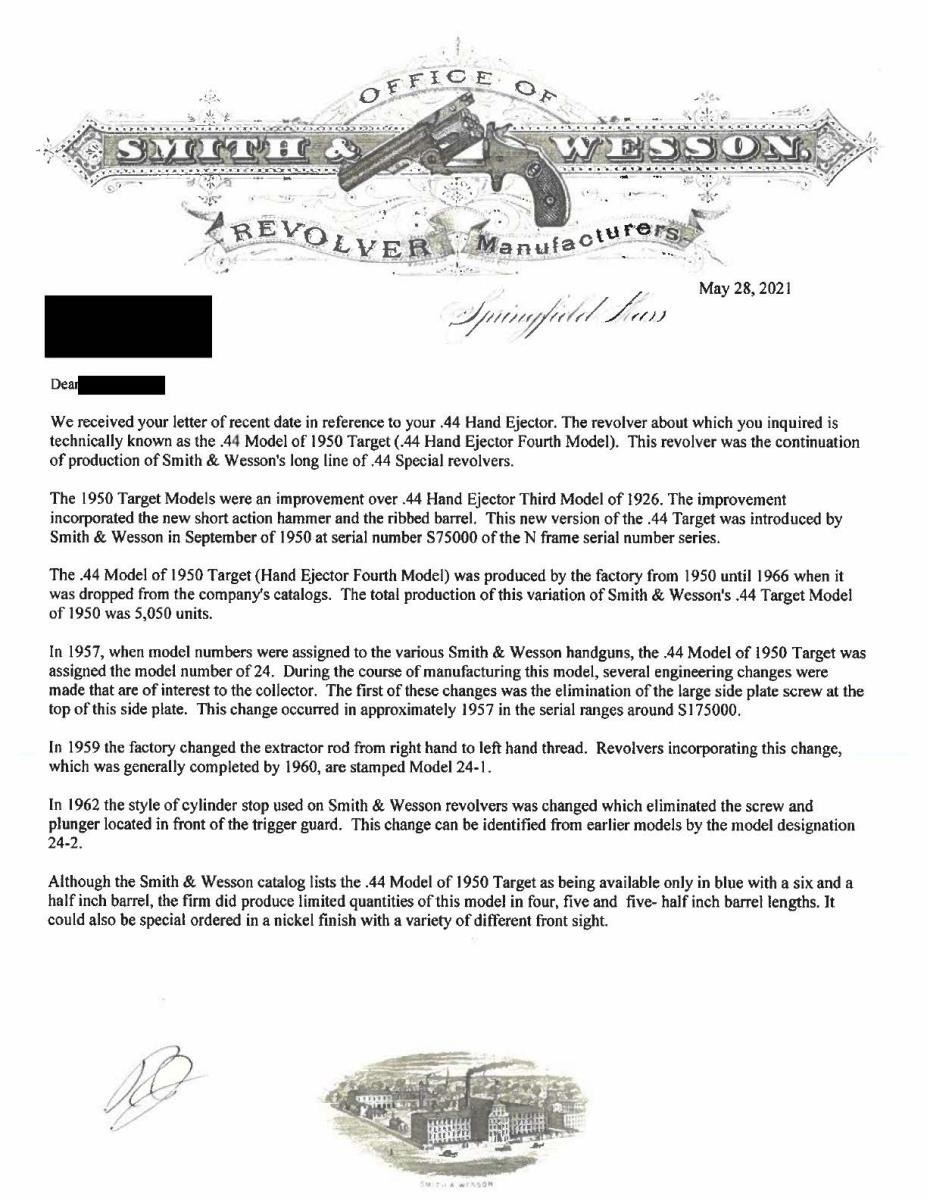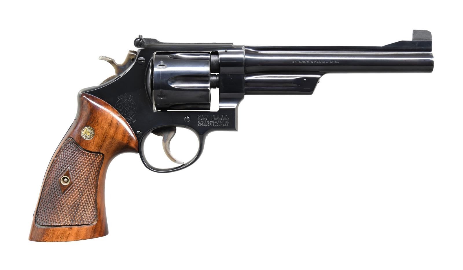 Cal. 44 Special. S# S146645. Bbl. pinned 6 1/2" w/ rib & shrouded ejector. Ramp mounted Patridge front sight w/ white outline square notch adj. rear sight. Six shot fluted cyl. N frame 5 screw action. Blue finish w/ case colored hammer & trigger. Goncalo Alves diamond checkered target grips w/ S&W medallions. 44 hand ejector 4th model revolver as mfg. from 1950-57. UNATTACHED ACCESSORIES: letter from the Office of Smith & Wesson Revolver Manufacturers detailing the history of the 1950 Target. CONDITION: over 98% blue showing a slight cyl. drag line. Grips show small handling marks. Bright near excellent bore. PROVENANCE: from The Collection of Gun Sport Ltd owned by Jon R. Thomas. (23-3889/DS). CURIO. $1,200-1,800.