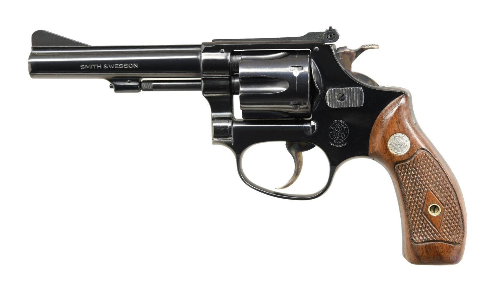 Cal. 22 LR. S# 26517. Bbl. 4" pinned. Ramped serrated blade front sight. Adjustable rear sight. Matching numbers on right grip panel, cyl. & extractor. Flat cyl. latch. Bbl. appears unnumbered. Mfg. 1950's. Blue finish. Case colored hammer & trigger. Checkered 2-piece round butt walnut grips w/ silver S&W medallions. CONDITION: grips show some light dings & handling marks. Hammer & trigger retain much of their case colors w/ some light operational wear. Balance of metal retains 93% original blue w/ scattered light scratches, handling & operational wear. Very good plus bright bore. PROVENANCE: The Collection of Gun Sport Ltd owned by Jon R. Thomas. (23-4257/MJC). CURIO. $1000-1500.