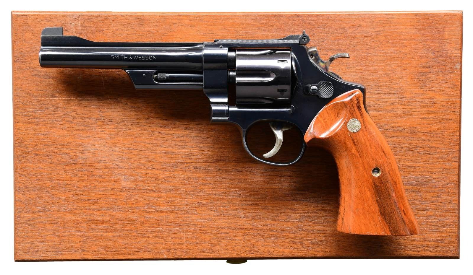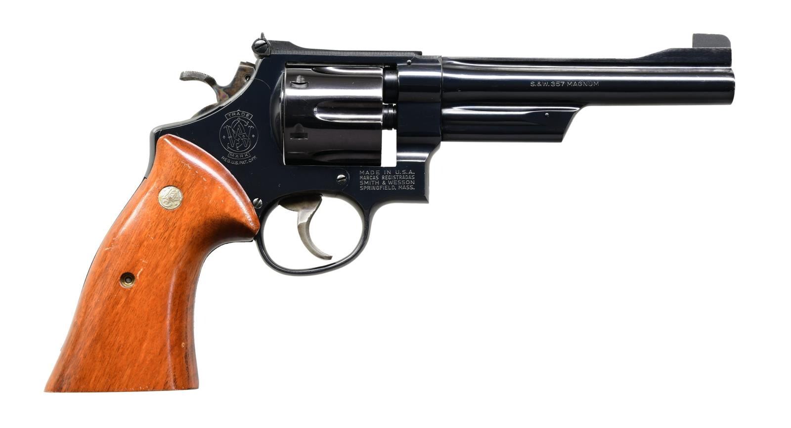 Cal. 357 Mag. S# N395924. Bbl. 6" pinned. Patridge front sight. Square notch adjustable rear sight. Mfg. 1975-76. Blued finish w/ case colored target trigger & hammer. Smooth walnut target grips w/ silver S&W medallions. UNATTACHED ACCESSORIES: display case w/ cleaning rod, screwdriver & paperwork. CONDITION: grips show some scattered light flaking & handling wear. Trigger & hammer retain much of their case colors w/ some operational wear. Balance of metal retains 98% original blue w/ a spot of light muzzle wear on right side. Action is functional when hand cycled. Bright near excellent bore. (24-2104/MJC). MODERN. $1400-1900.
