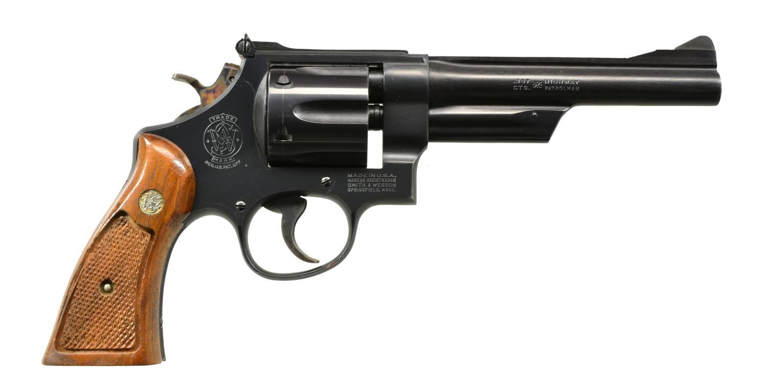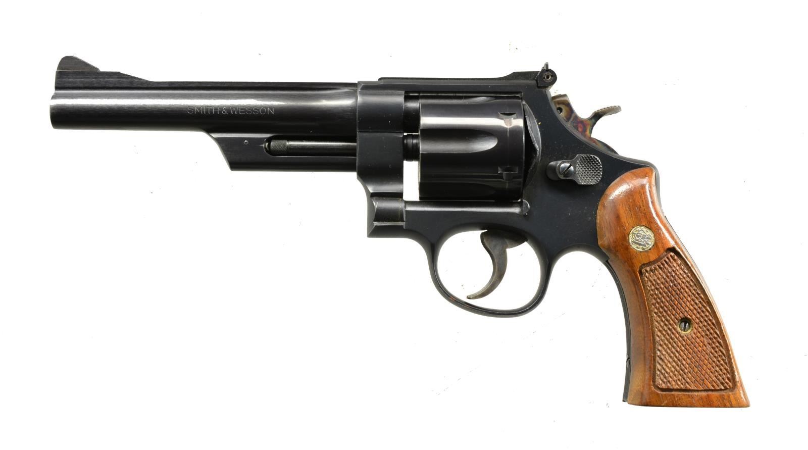 Cal. 357 Mag. S# N953249. Bbl. 6" w/ rib, serrated ramp front sight & adj. square notch target rear sight. 6 Shot fluted cyl. Blue finished 3 screw action w/ case colored hammer & trigger. 2 Piece checkered Magna grips w/ silver S&W medallions. CONDITION: over 95% blue showing a cyl. drag line & a few sm. marks. Grips show wear spots w/ chip behind checkering on right panel. Crisp mechanics. Bore is bright w/ strong rifling. (20-1645/DS). MODERN. $500-800.