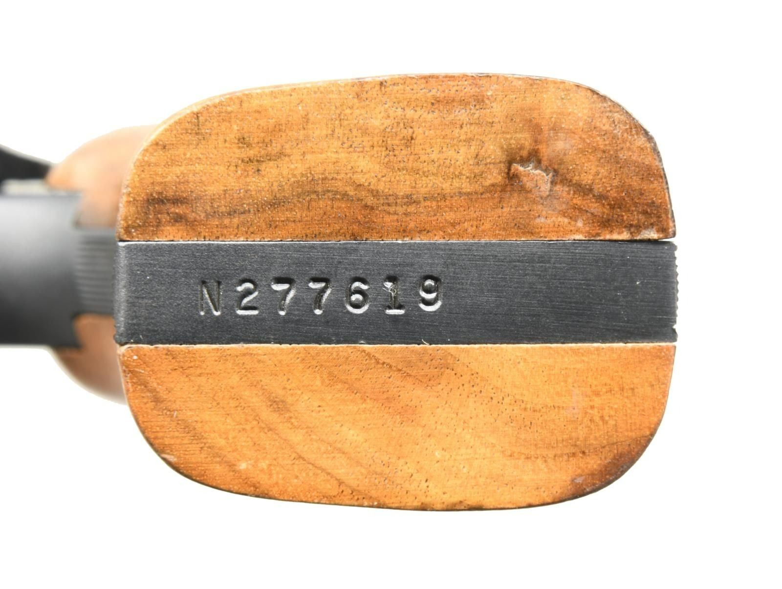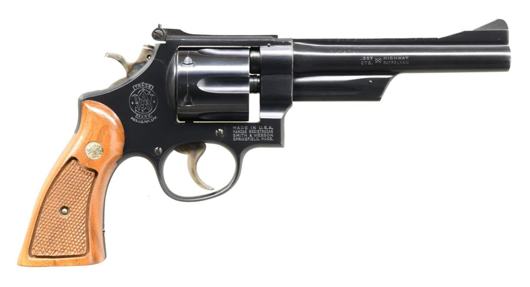 REVOLVER. S# N277619. Bbl. 6" pinned. Ramped serrated blade front sight. Adjustable rear sight. Mfg. 1975-77. Blue finish. Case colored trigger & hammer. Checkered Magna grips w/ silver S&W medallions. UNATTACHED ACCESSORIES: matching numbered factory box w/ cleaning rod, bore brush & screwdriver. CONDITION: grips show light handling wear. Trigger & hammer retain most of their original case colors but show operational wear. Balance of metal retains 93% original blue w/ some operational wear, edge wear, scattered light oxidation mostly along the high edges. Very good plus bright bore. PROVENANCE: The Collection of Gun Sport Ltd owned by Jon R. Thomas. (23-4347/MJC). MODERN. $1000-1500.