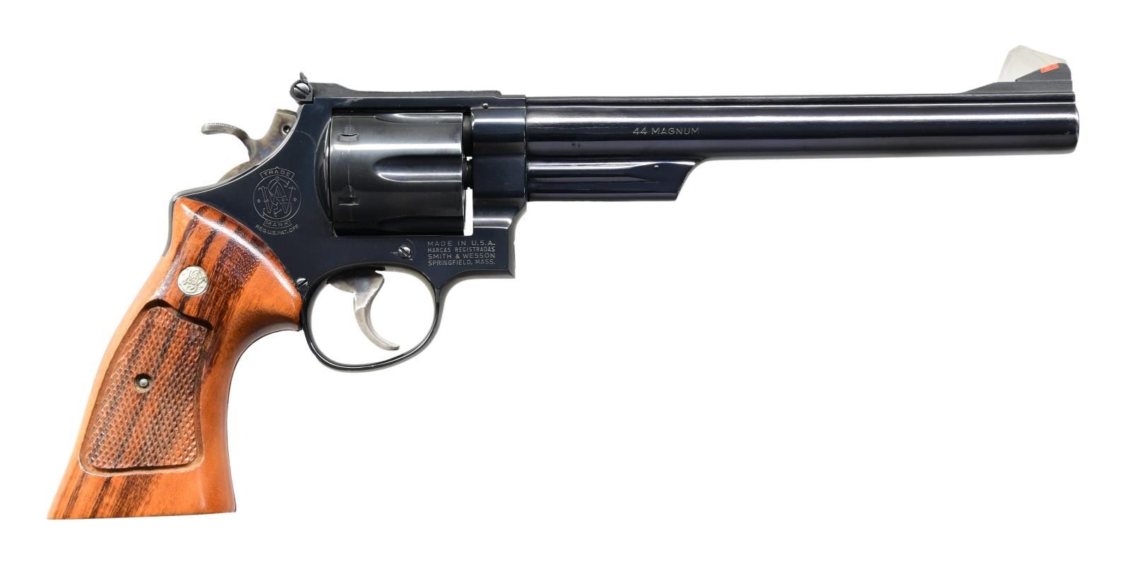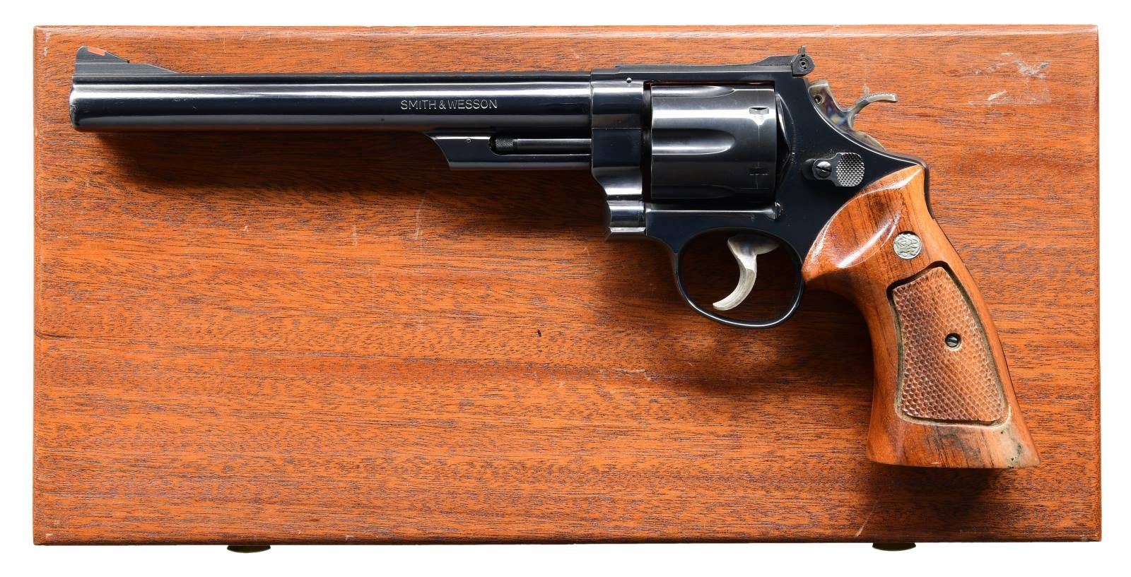 Cal. 44 Mag. S# N723150. Bbl. 8 3/8" pinned. Ramped serrated blade front sight w/ red insert. Adjustable square notch white outline rear sight. Mfg. 1980. Blued finish w/ case colored target trigger & hammer. Trigger pull appears nicer than usual & likely has had work performed. Checkered walnut target grips w/ silver S&W medallions. UNATTACHED ACCESSORIES: walnut display case w/ cleaning rod. CONDITION: back of right panel has a small crack. Grips otherwise show a couple patches of finish loss, some minor black staining & light checkering wear. Trigger & hammer retain most of their case colors w/ some operational wear. Balance of metal retains 97% original blue w/ some muzzle wear, a drag line on cyl. & some light scratches on bottom of trigger guard. Bright near excellent bore. (24-768/MJC). MODERN. $1100-1600.