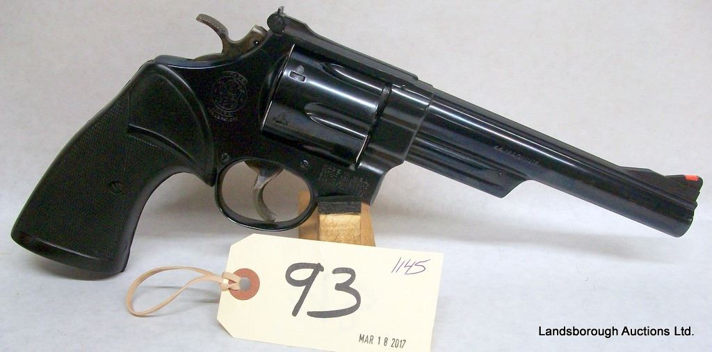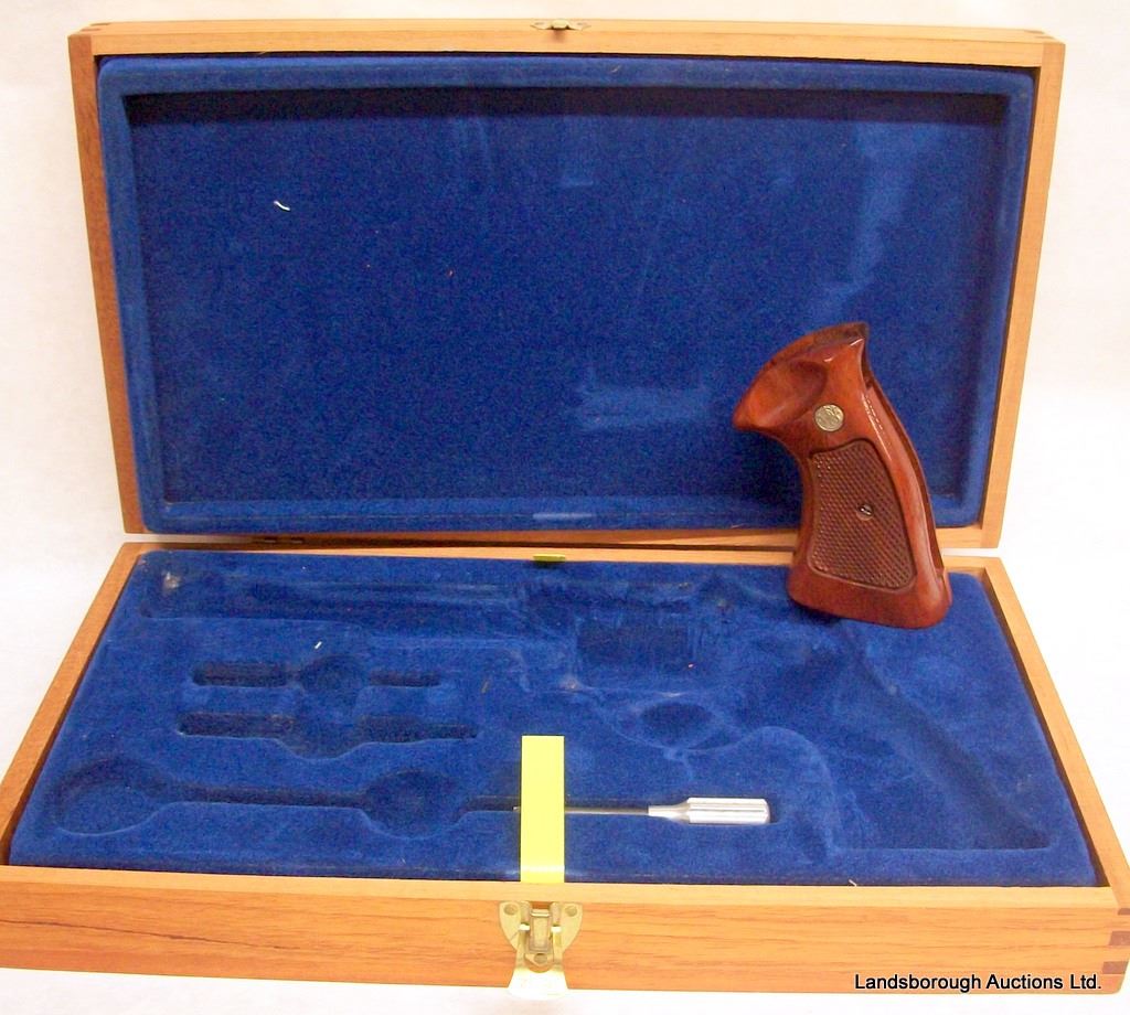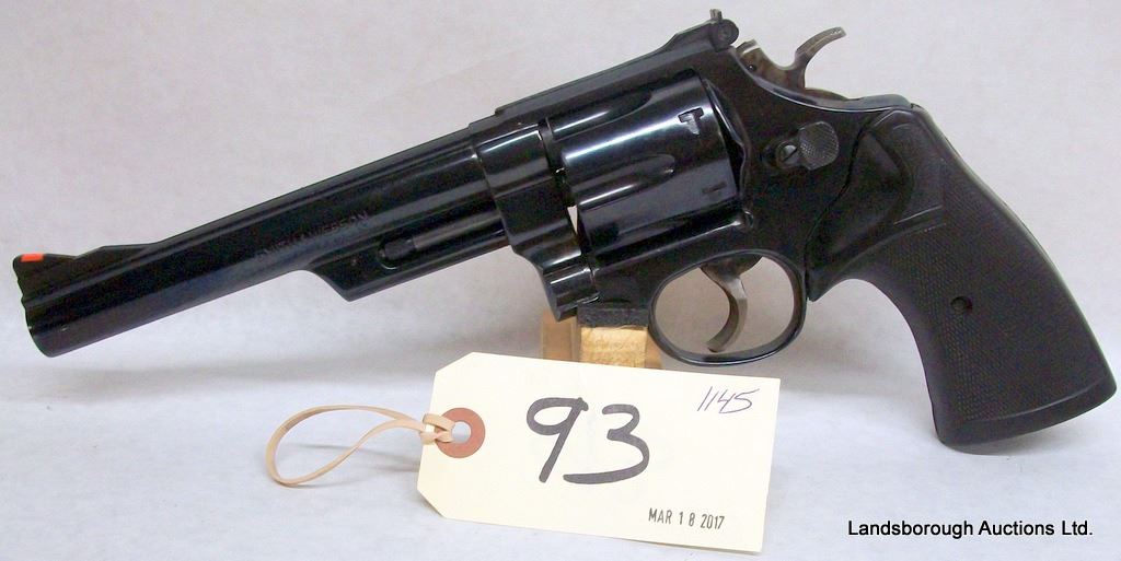 RESTRICTED, REVOLVER, 44 MAGNUM, 165MM BARREL, SN N469775. ORIGINAL WOOD GRIPS EXCELLENT, PACHMAYR RUBBER GRIPS HAVE A MARK, BLUING HAS ONE PIT MARK AND SOME WEAR AT MUZZLE, BORE HAS A LITTLE PITTING. COMES WITH WOODEN DISPLAY BOX. ONE OWNER ONLY.