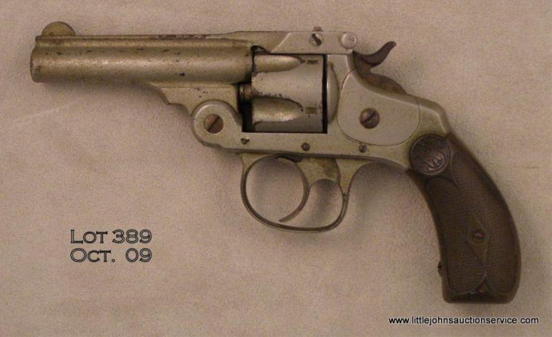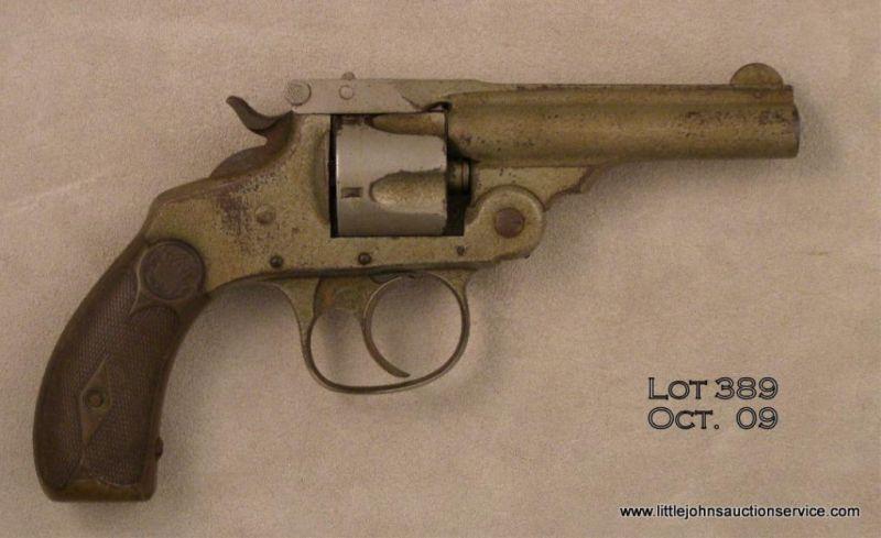 SMITH & WESSON .32 DA 4th Model, # 90215, .32 cal., 3” barrel, nickel finish, checkered hard rubber grips. Revolver is in good condition overall in need of a good cleaning. Approximately 70% of the original finish remains, which hasdrifted to a dark patina. Est. $75-$150.