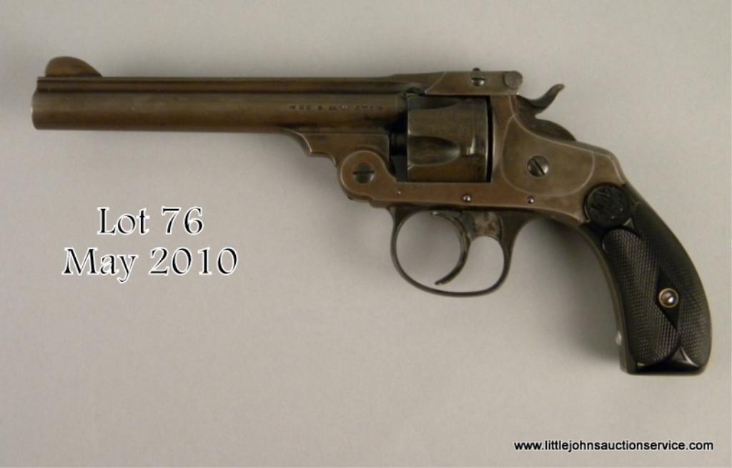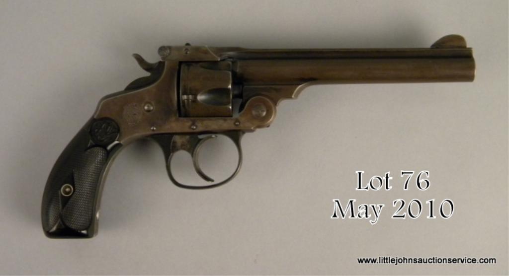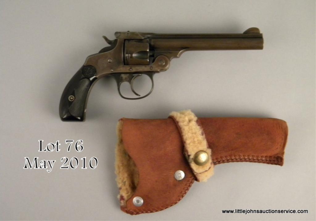 SMITH & WESSON .32 Double Action, # 264972, .32 S&W, 4.5" barrel, checkered hard rubber grips. Revolver is in good condition overall, showing a nice brown patina with traces of blue in the protected areas. Grips are very good showing some losses to the checkering , but no chips or cracks. Wool lined suede holster included. Est. $125-$250.