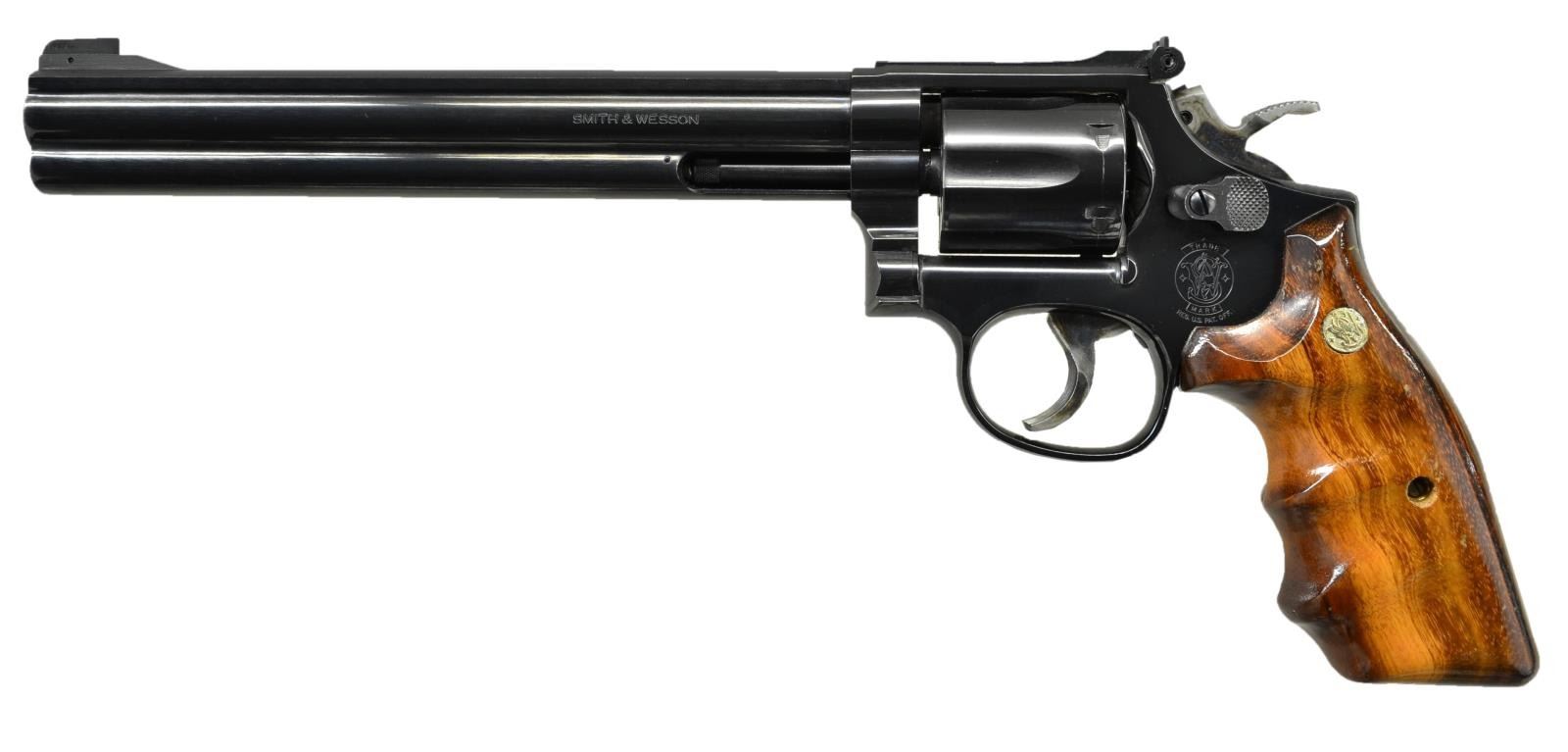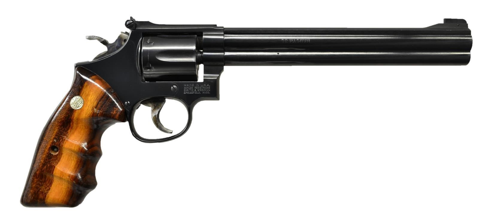 Cal. 32 H&R Mag. S# BEH0957. Bbl. 8 3/8" full lug w/ Patridge front sight plus corresponding frame mounted Micrometer rear. Blued model mfg. w/ long bbl. 1990 & 1991 only; in other lengths from 1990-1992. Masterpiece reintroduction of famed K-32 revolver of 1947-1974. Very versatile chambering allowing use of 32 S&W plus 32 S&W Long interchangeably w/ Magnum chambering. Case colored target trigger & target hammer. Replacement factory Goncalo Alves smooth finger grooved grips dated Oct. 1999. CONDITION: overall near excellent having light cyl. turn line plus faint firing residue. Near excellent bore. Light grip marks. (22-4438/NW). MODERN. $800-1,200.