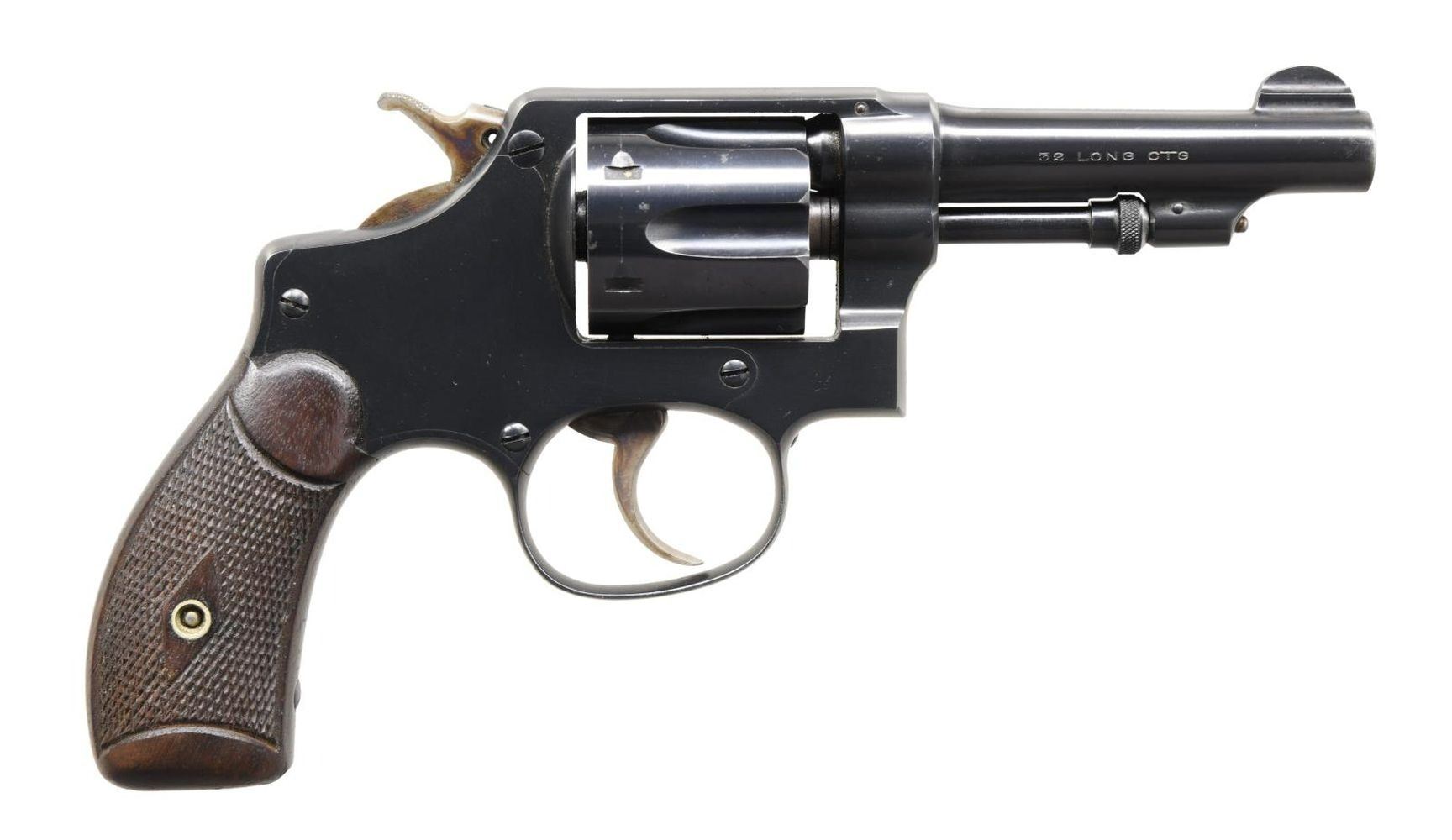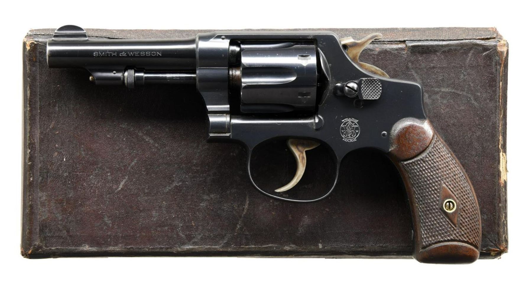 Cal. 32 S&W Long. S# 366537. Bbl. 3 1/4" pinned. Round blade front sight. Fixed rear sight. Mfg. 1917-42. Matching numbers on cyl. bbl. & extractor. Blue finish. Case colored hammer & trigger. Checkered round butt grips w/ stencil numbered matching right panel. UNATTACHED ACCESSORIES: matching unnumbered factory box in fair condition. CONDITION: grips show a couple chips, some dings & handling wear. Hammer & trigger retain much of their case colors but show some operational wear & light oxidation. Balance of metal retains 85% factory quality reblue w/ scattered freckling, edge & operational wear. Good bright bore that shows a patch of pitting but strong rifling. PROVENANCE: The Collection of Gun Sport Ltd owned by Jon R. Thomas. (23-4262/MJC). CURIO. $800-1200. `