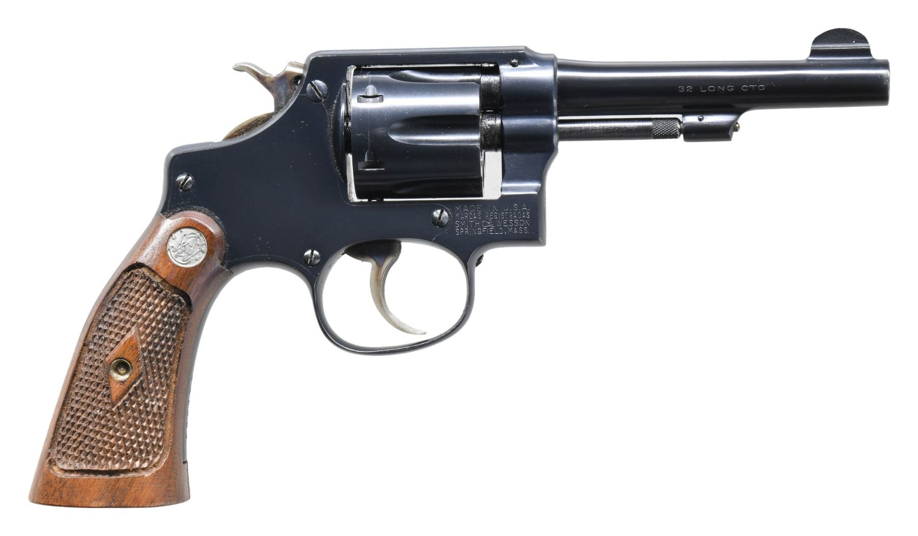 Cal. 32 S&W Long. S# 586172. Bbl. 4" pinned. Round blade front sight. Fixed rear sight. Matching numbers on frame, bbl., cyl., extractor & right grip panel. Post-war 32 Regulation Police revolver. Blued finish with case colored hammer & trigger. Checkered walnut diamond center grips with silver S&W medallions. UNATTACHED ACCESSORIES: matching numbered correct red box that has some ink writing on bottom part. CONDITION: grips show some light handling marks. Hammer & trigger retain most of their case colors with some light operational wear. Balance of metal retains 98% factory quality blue with some light muzzle wear, a couple specks of oxidation & some usage wear. Action functions properly when hand cycled. Very good bright bore. (25-3680/MJC). CURIO. $500-700.