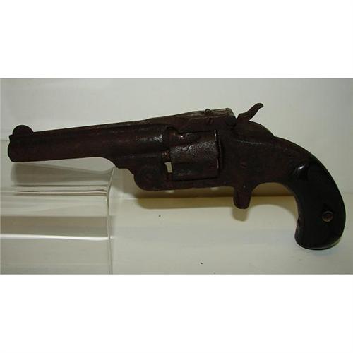 SMITH & WESSON 32 SA REVOLVER. Top break. .32 cal. Spur trigger. 5 shot. S/N 5651. Bird’s head butt. Barrel is 3.5” L. Marked illegibly on top of barrel. Gun shows severe rusting and pitting.