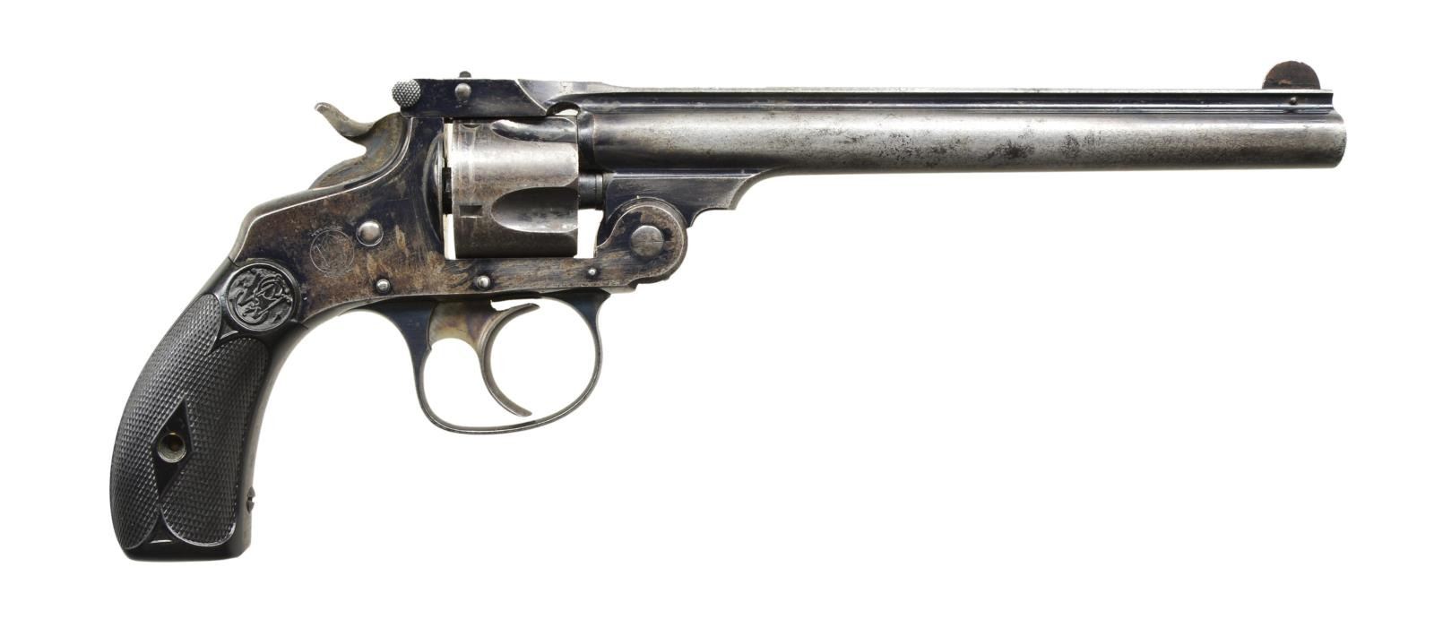 Cal. 32 S&W. S# 245156. Bbl. 6". This 4th Model has the scarce 6" barrel w/ fixed front & simple notch rear sights. Matching S#s on the butt, cylinder & Bbl. latch. Blued finish & case colored hammer & trigger. S&W monogram hard rubber grips scratch numbered to another revolver. CONDITION: Metal retains about 30% original blue, strongest on the frame, Bbl. cleaned w/ light scattered pitting & rib has a soldered repair mid way from muzzle. Grips are worn, with light scratches. Bore is bright & strongly rifled w/ scattered pits throughout. PROVENANCE STATEMENT: Estate collection of Thomas F. Wolfinger. (22-6132/CW). CURIO. $250-350.