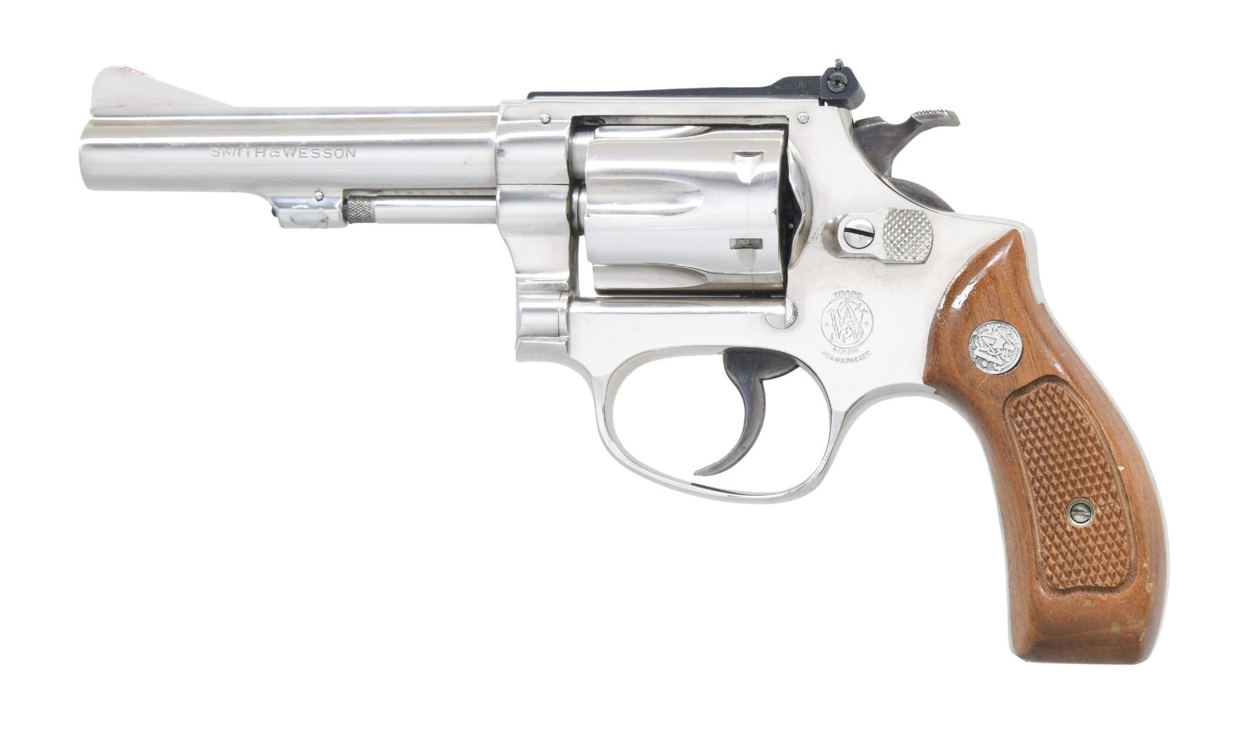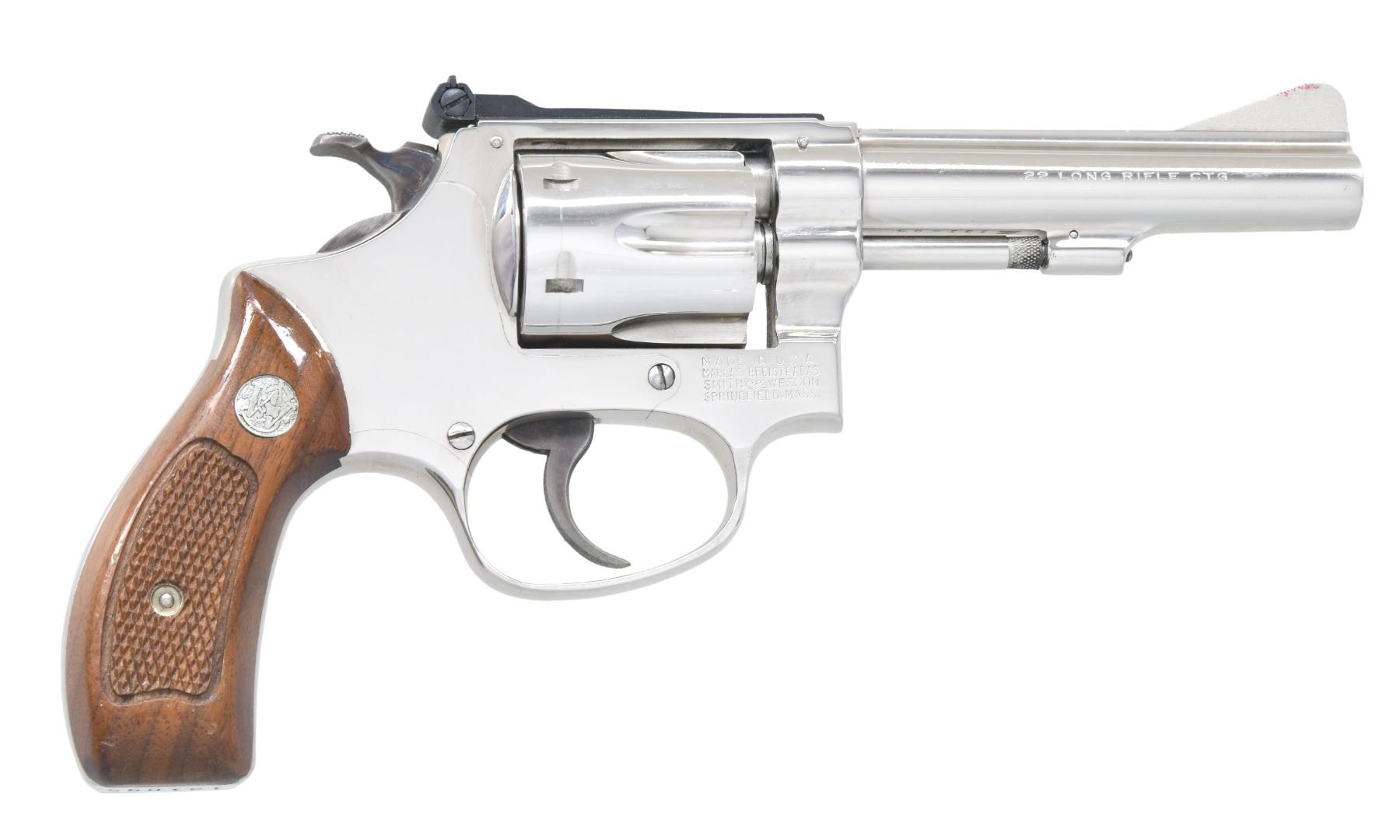 Cal. 22 LR. S# 131095. Bbl. 4". Red insert ramp front sight w/ adj. rear sight. Six shot fluted cyl. Nickel finish. Round butt checkered walnut grips w/ S&W medallions. CONDITION: 98% nickel finish showing a cyl. drag line. Grips show a few small handling marks. Bright near excellent bore. (24-5635/DS). CURIO. $700-1,000.