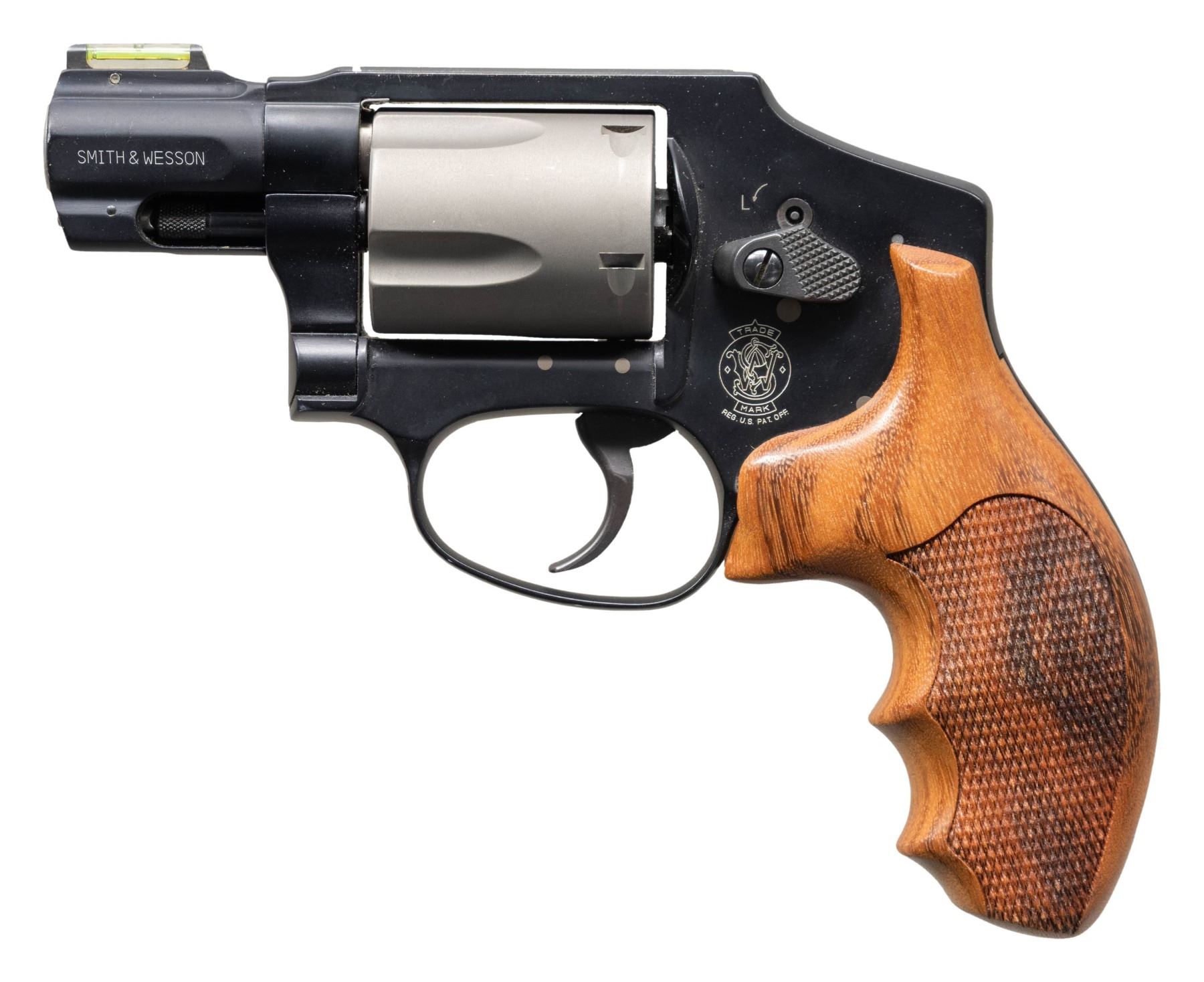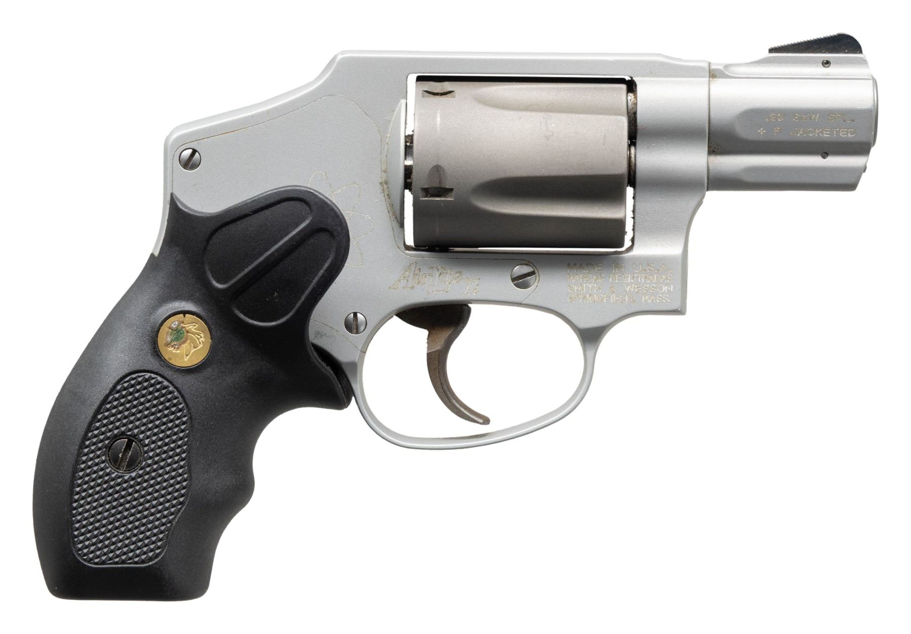 1) MODEL 340 PD. Cal. 357 Mag. S# CMM0035. Bbl. 1 7/8". Fiber optic front sight. Fixed rear sight. DAO J-frame revolver with 5-shot titanium alloy cyl. Balance of other parts have matte black finish. Checkered hardwood grips. CONDITION: grips show light handling wear. Metal shows some light handling, edge & operational wear. Action functions properly when hand cycled. Very good bright bore. (25-4660/MJC). 2) MODEL 342. Cal. 38 Spl + P. S# CDL1813. Bbl. 1 7/8". Ramped serrated blade front sight. Fixed rear sight. DAO Airlite 342 with 5-shot titanium cyl. Case colored hammer. Balance of metal has stainless finish. Grooved backstrap. Aftermarket black grips with gold horse medallions. UNATTACHED ACCESSORIES: matching numbered factory box with hardcase, manual, paperwork & trigger lock. CONDITION: grips show light handling wear. Metal shows a few spots of light oxidation, some handling & operational wear. Action functions properly when hand cycled. Bright near excellent bore. (25-4678/MJC). ALL MODERN. $600-950.