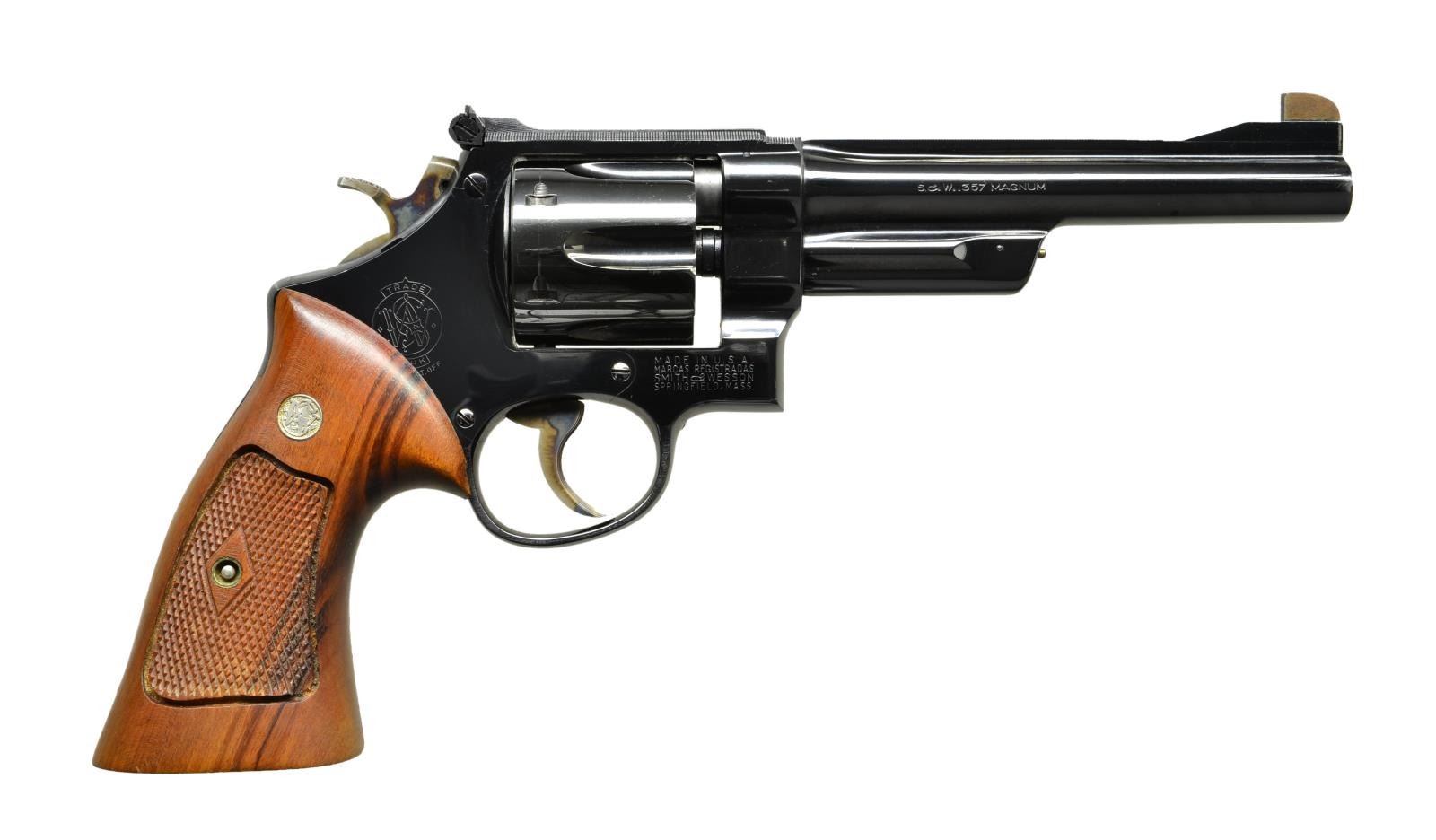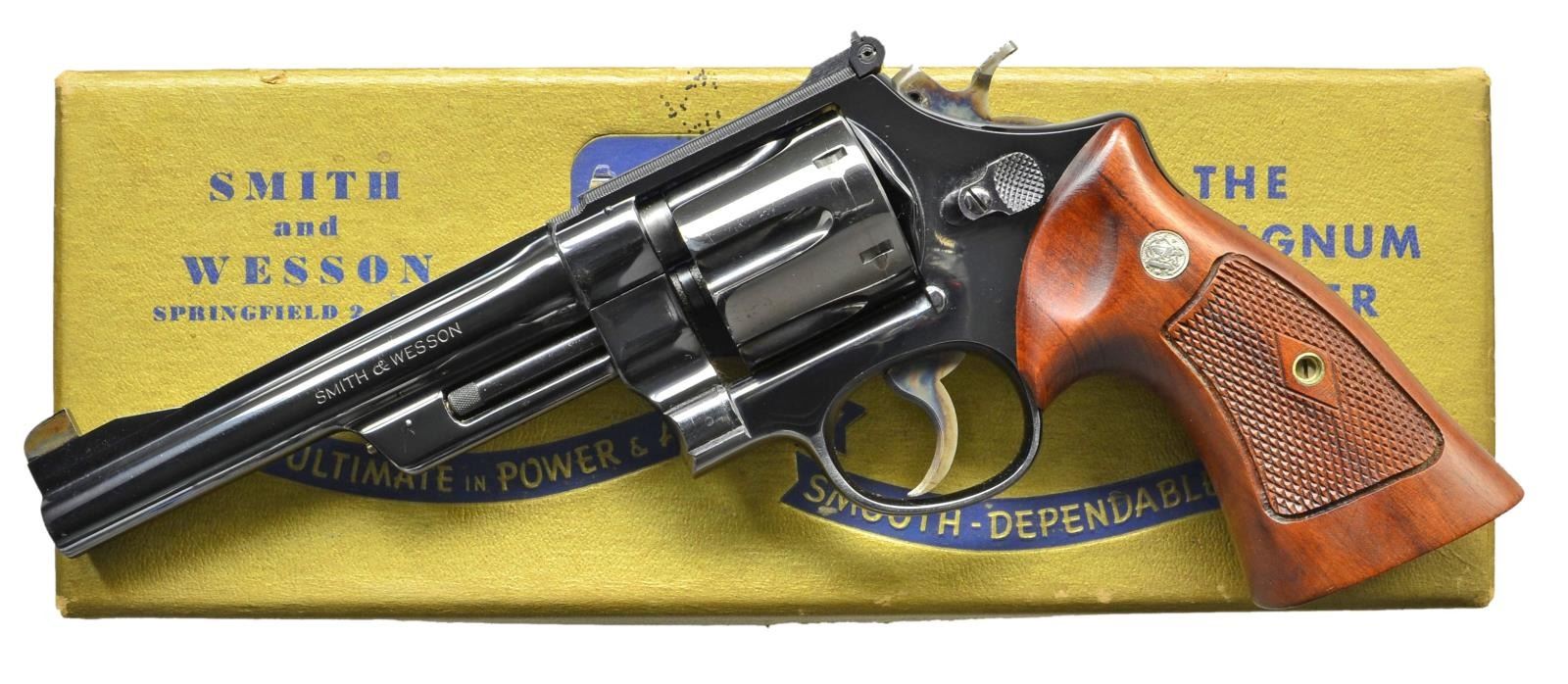 Cal. 357 Mag. S# S80012. Mfg. 1950. Bbl. 6" pinned with fine checkered rib & matching top strap of frame. Semi target checkered hammer. Serrated trigger & grip straps. 6 Shot fluted, recessed cyl. Checkered diamond S& W target grips with thumb rest. Matching numbered bbl., cyl. & extractor. UNATTACHED ACCESSORIES: gold 2 piece .357 Magnum box numbered to another gun. CONDITION: overall very fine factor quality refinished condition with some minor filing done to the front sight. Some minor handling marks present. Light drag line on cyl. Vivid case coloring. Very good grips with a few scattered handling marks. (22-5337/ZAL). CURIO. $1,300-1,800.