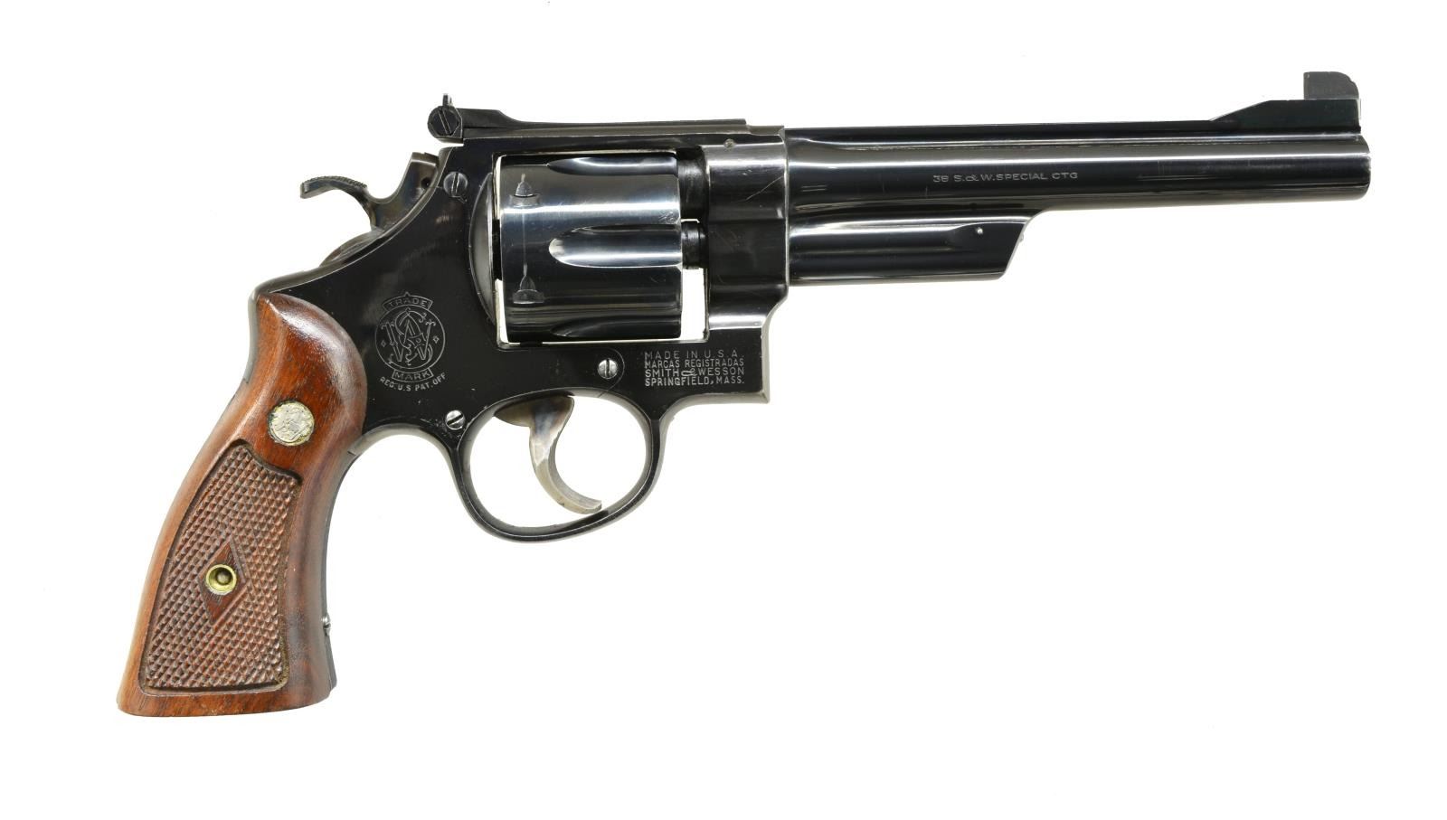 Cal. 38 Spl. S# S145030. Bbl. 6 1/2" w/ fully shrouded ejector & rib. Patridge front sight w/ square notch adj. rear sight. 6 Shot fluted cyl. Post War N frame revolver w/ pinned bbl. & 5 screw action. Case colored target hammer & trigger. 2 Piece checkered walnut Magna grips w/ S&W medallions. CONDITION: over 80% blue showing scattered scratches, handling marks & light edge wear. Grips show light wear & marks. Bright bore w/ sharp rifling. (20-3690/DS). CURIO. $800-1,200.