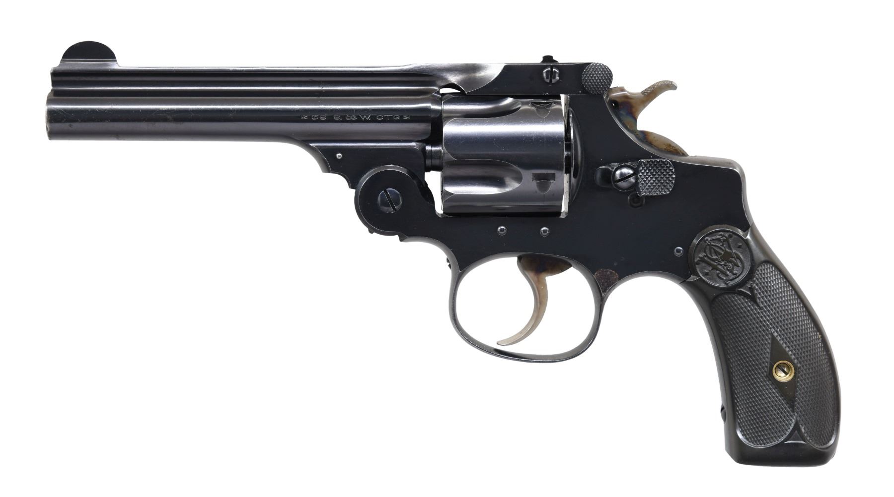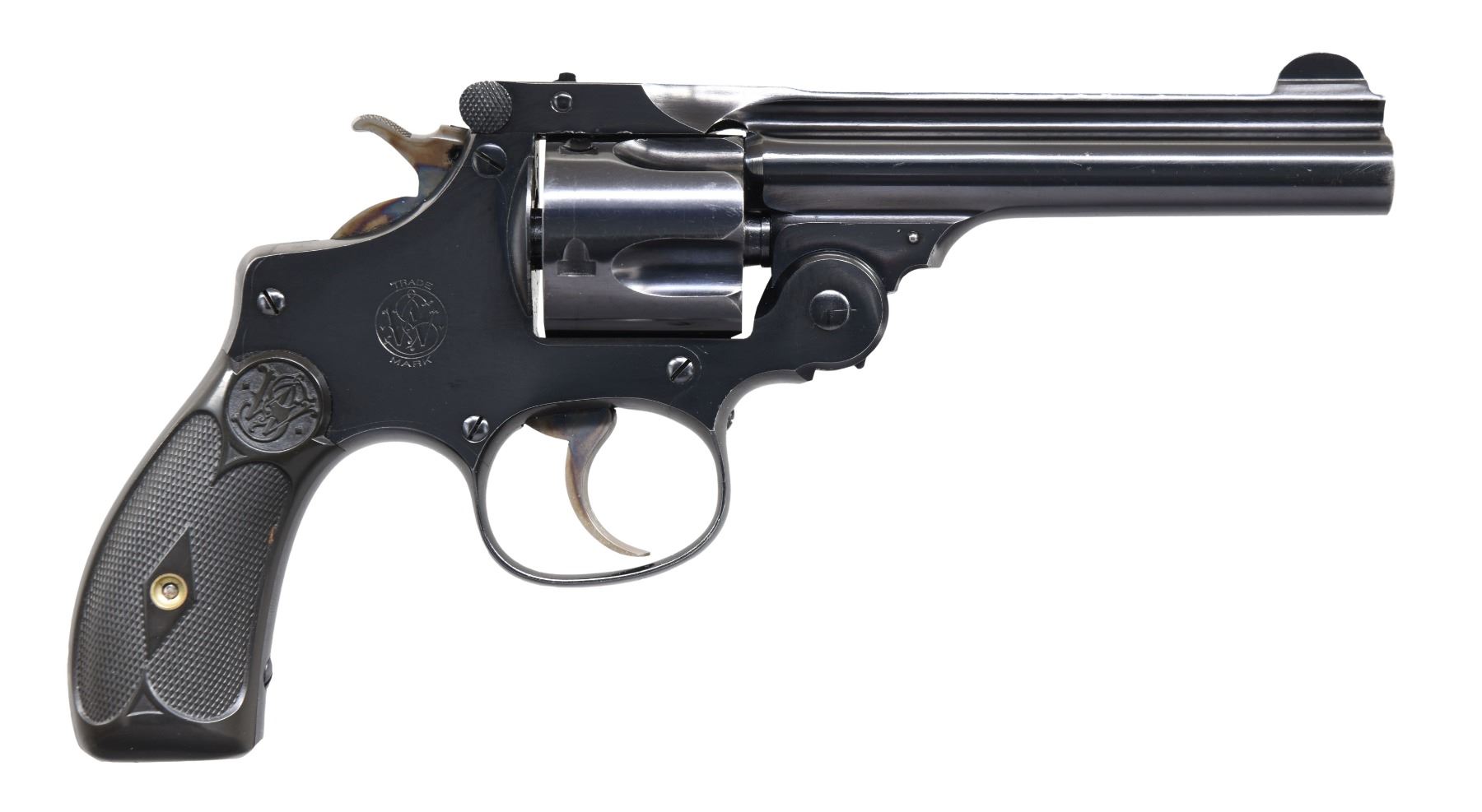 Cal. 38 S&W. S# 52995. Bbl. 4". Round blade front sight. U-notch rear sight. Matching numbers on frame, bbl. latch & cyl. Perfected 38 Double Action revolver with both top break latch & frame cyl. release made between 1909-1920. Blued finish with case colored trigger & hammer. Checkered brown hard rubber grips with S&W monograms. Right grip panel appears to be stamped matching but the last digit is obscured by a flaked patch. CONDITION: grips show scattered light handling marks. Trigger & hammer retain nearly all their case colors with some light operational wear. Balance of metal retains 95% factory quality reblue with scattered edge & operational wear. Action functions properly when hand cycled. Bright near excellent bore. PROVENANCE: From the Lifelong Collection of George Staden S&W Member #3451. (25-33/MJC). CURIO. $800-1200.