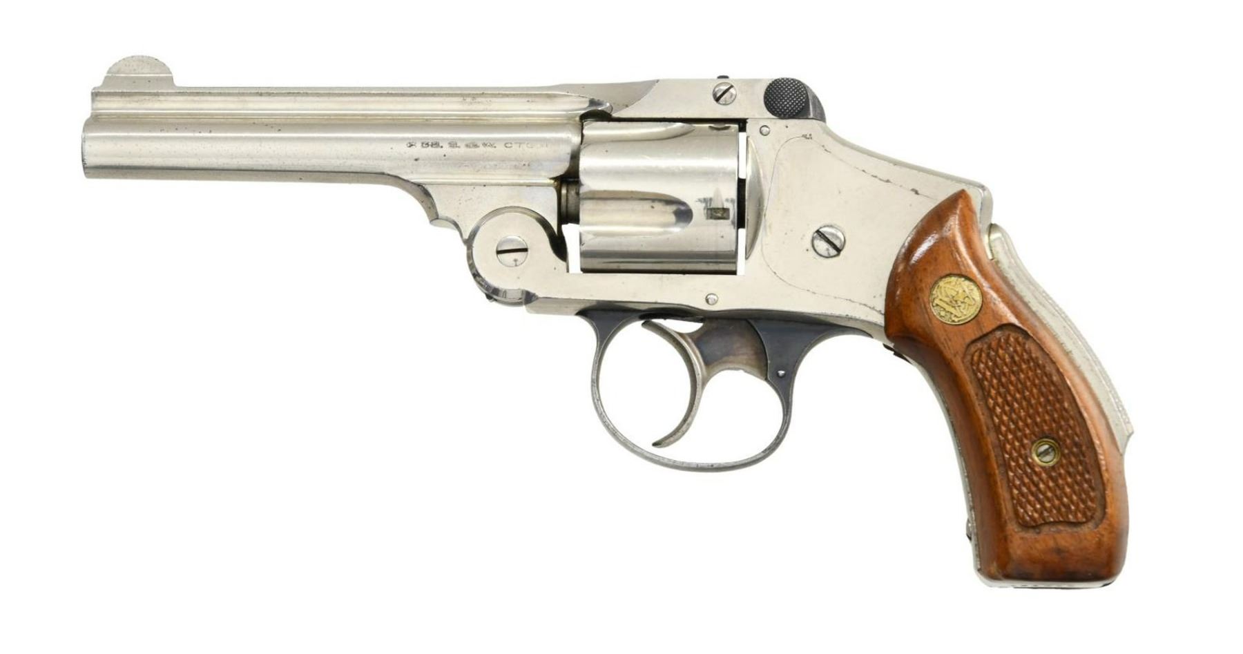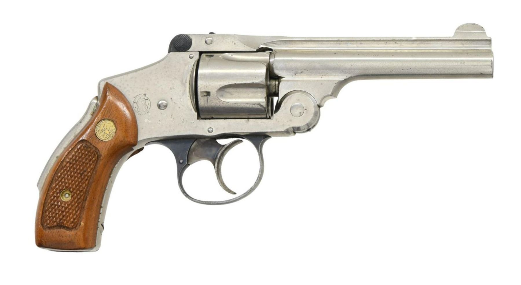 Cal. 38 S&W. S# 217791. Bbl. 4". Round blade front sight. U-notch rear sight. 4th Model 38 Safety Hammerless mfg. 1898-1907. Matching numbers on cyl. & top strap. Nickel finish w/ case colored trigger. Replacement mismatched checkered walnut magna grips w/ S&W medallions. CONDITION: left grip panel shows a gouge at front bottom, grips otherwise show some dings & handling wear. Trigger retains a strong amount of case colors w/ some light oxidation & operational wear. Balance of metal retains much nickel finish but shows scattered flaking, oxidation & some dings. Good bore w/ some scattered pitting & oxidation but strong rifling. (23-5251/MJC). CURIO. $400-600.